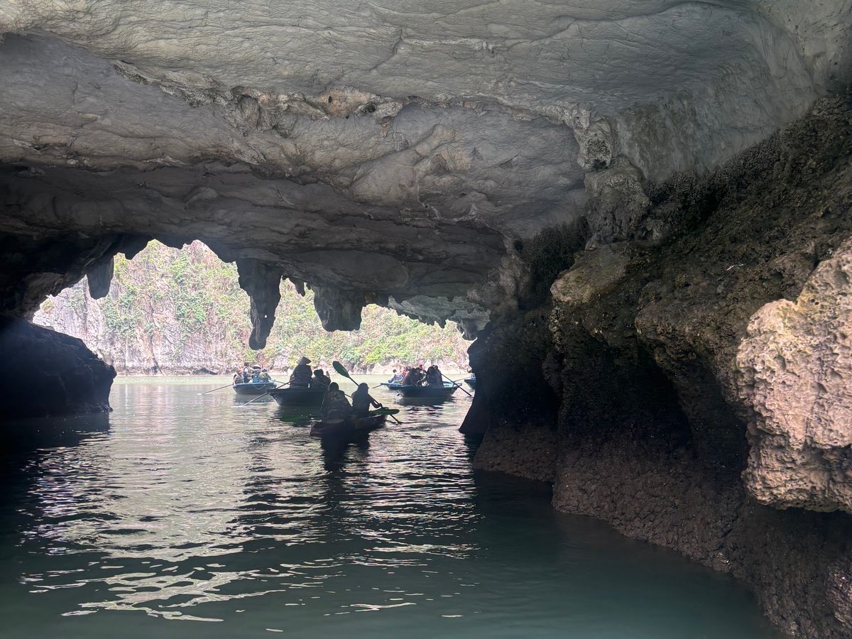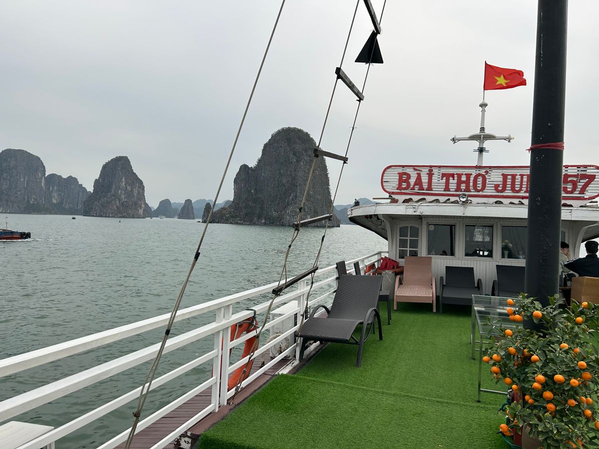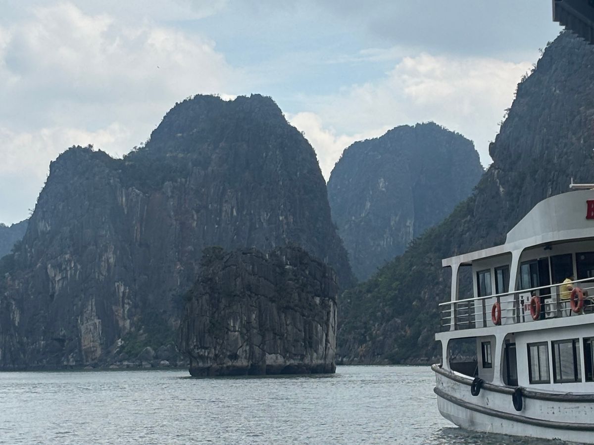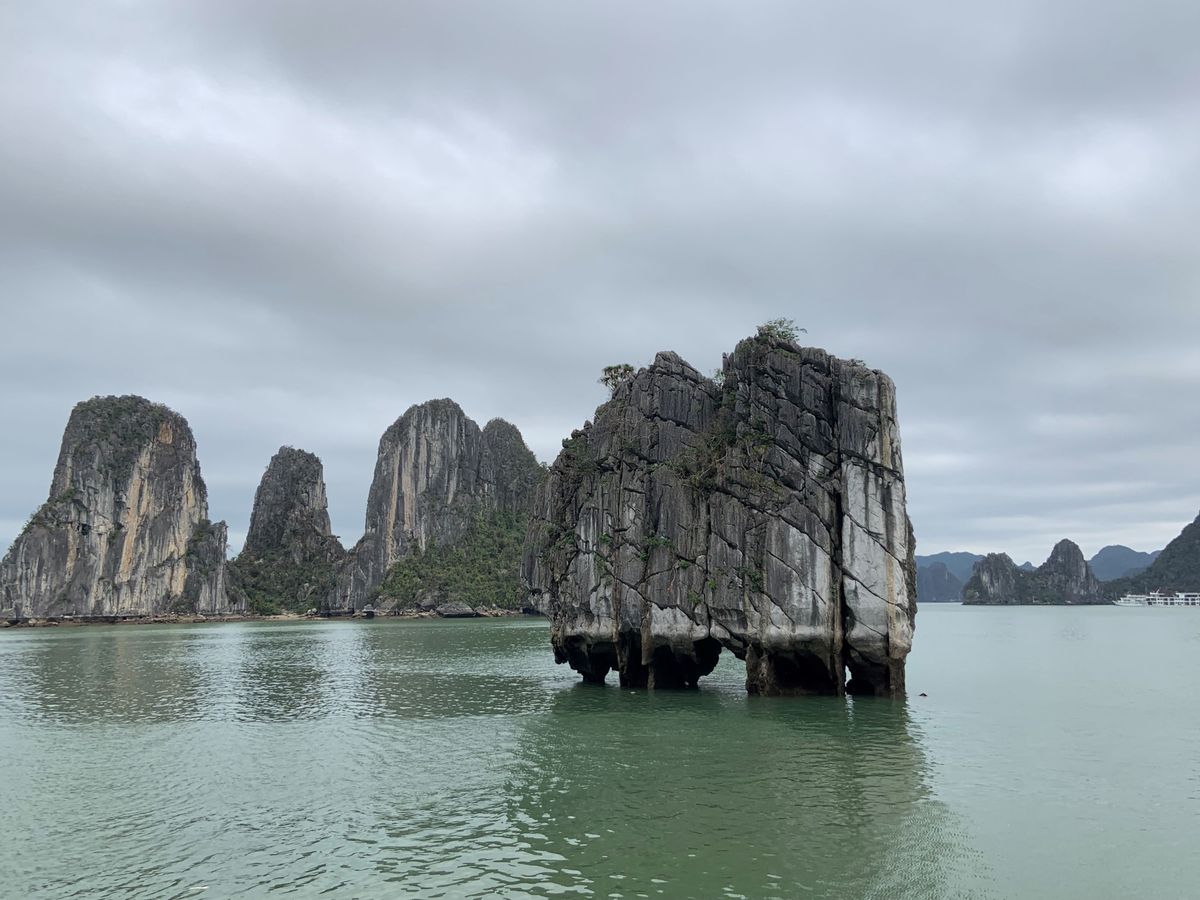 ツアーの流れは、ピックアップされてバスに乗り、ハロン湾についてから船へ。乗船後、昼食を食べながらクルージング。一段落すると、小船での散策と、上陸してからの鍾乳洞の見学。その後は、船で港に戻って下船し、バスで再び戻るという行程でした。ハロン湾は晴れていれば非常に快適ですが、曇りでもそこそこ絶景ですし、上陸してからの鍾乳洞も見どころ満載なので、多少天気が悪くても参加する意味はあります。