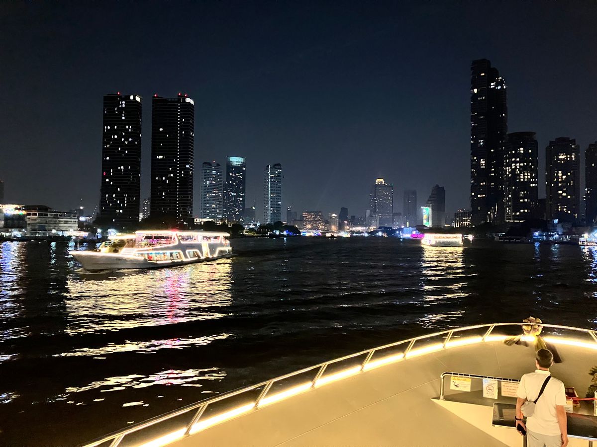 1時間程度で十分食べたので、ラーマ8世橋でUターンしてから船首のデッキに出て夜景観賞。外の座席は自由席が用意されていないので、立って夜景観賞。足腰がしっかりしていれば立って楽しんでも揺れもないし、問題なし。写真のごとくキレイな夜景観賞をしながら、アイコンサイアムを通り過ぎ下流方向へ、観覧車のテーマパークあたりで、再びUターンして上流方向にもどり、ほぼ定刻の21:30に下船した。コスパ的には合格と思います。
