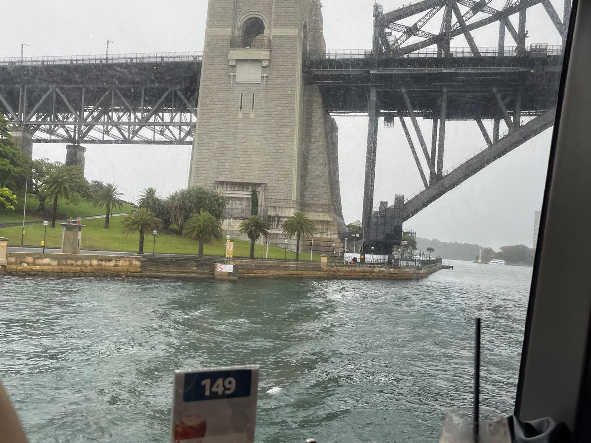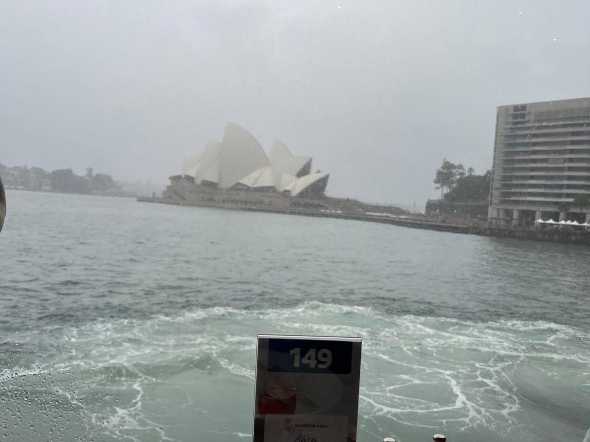 あいにくの雨模様。夕日はおろか陽の光さえ見れず。アンラッキーでした。そもそも、2月のオーストラリアは陽が長く、下船時間の19時頃もまだ明るいので、ナイトクルーズの時間帯の方が夕日が見れるかもしれません。天気は仕方ないですが、日没時間はチェックしておくべきでした。また、夜はオペラハウスやハーバーブリッジがライトアップされるので、雨でも見応えがありそうです。