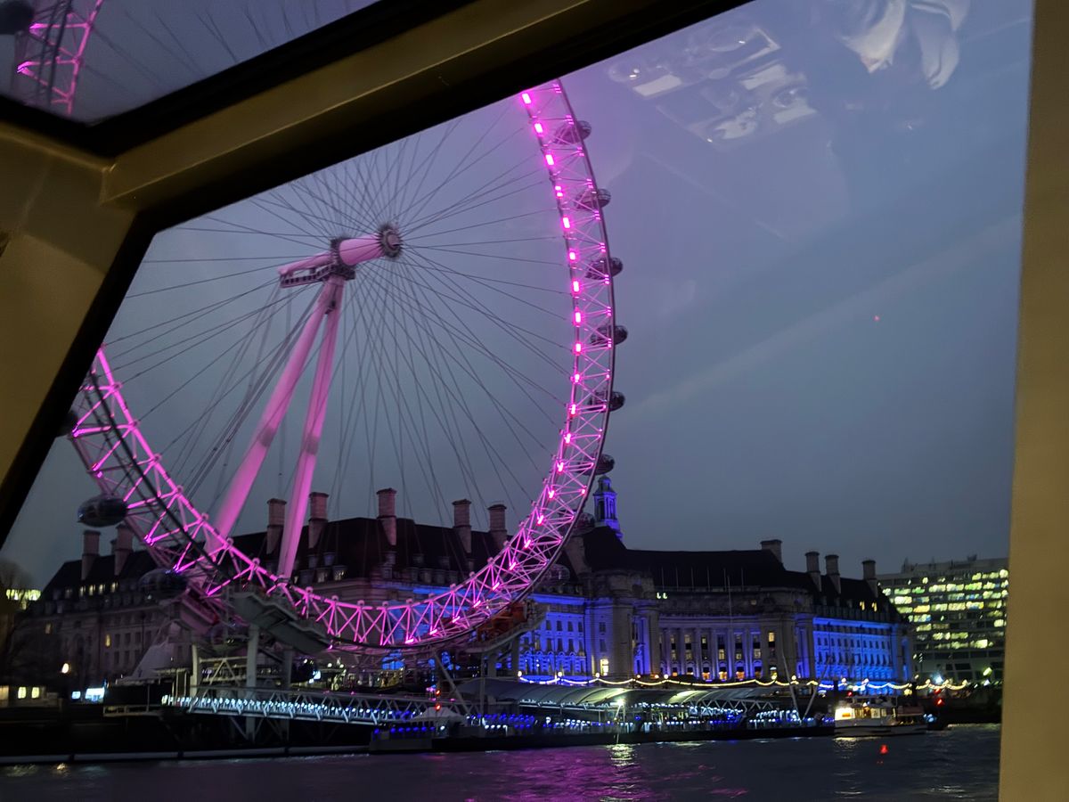 ロンドンブリッジ駅から、橋を渡って対岸の集合場所である船着場まで15分ぐらいでした。乗り場は向かって左手でしたが間違えてもスタッフがいるので、チケットを見せれば教えてくれます。クルーズの座席はグループごとに指定されていました。12月は16時には暗くなるので、テムズ川の夜景を楽しむことが出来ました。