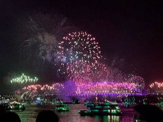 トイレが1階にあったので、1階のフロアと2階のフロアの様子を見ることができました。各階ごとに料理と雰囲気が違ってました。1階が大盛りなら2階はダンスしてたり、最上階は静かに音楽を聴いているような感じです。料理も最上階は私達には高級すぎて難しかったです(笑)私達には2階の料理の方が馴染みがありそちらにすればよかったと思いました。スカイデッキは風が強く寒かったので、カウントダウンの10分くらい前に行くと、ロープが張られて前方には行けず後方でしか見れなかったのが残念でした。しかし花火は長時間打ち上げられていてとても素晴らしかったです。帰りが1時の予定でしたが港が混雑しているのか?順番があるのか?港に到着したのは2時でした。