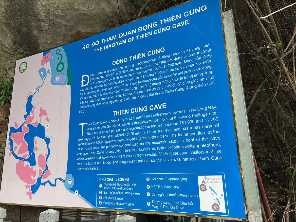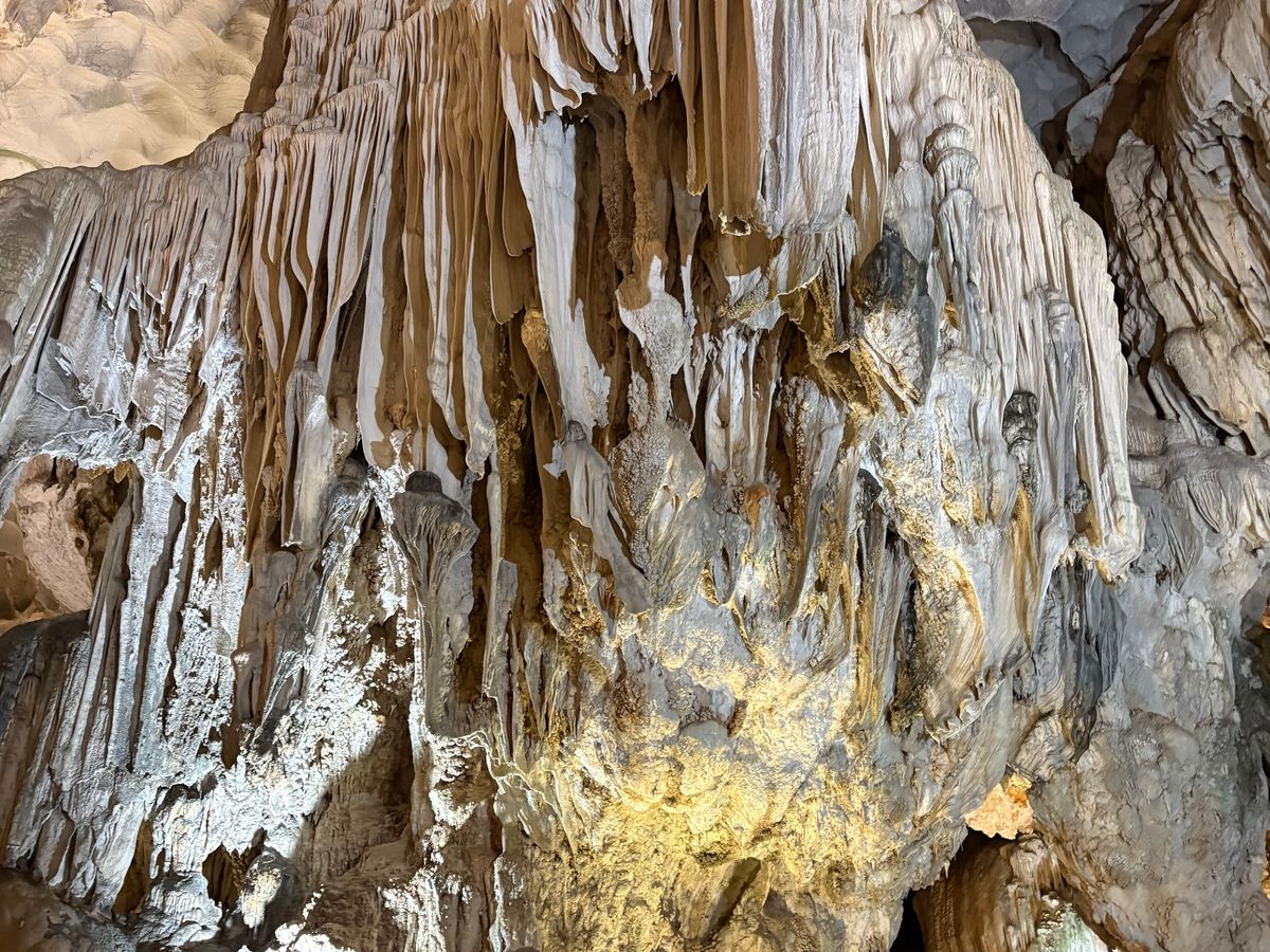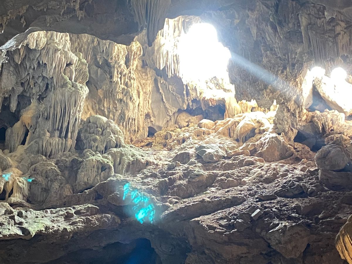 そこからティエンクン洞窟に移動して上下動の激しい内部を散策。様々な動物他に見立てた天然の造形物を眺め、この洞窟を見つけるきっかけになった洞穴からは明るい光が差し込んでいました。