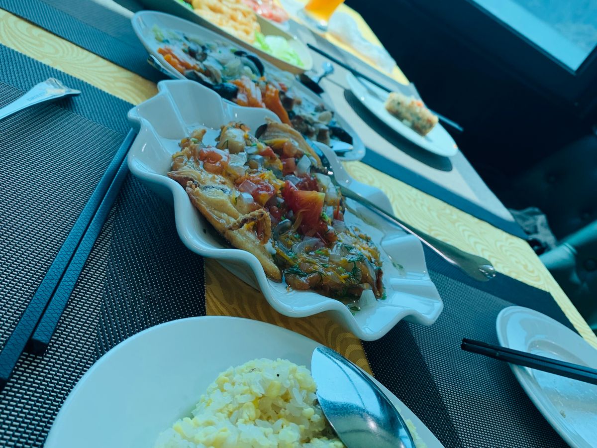 港につくとクルーズ船に案内され、出航とほぼ同時に海鮮ランチがスタートします。コースというよりは決められた料理が一斉に運ばれてくる感じでした。量は十分ですし味もそれなりに美味しかったです。飲み物は別料金ですが缶ジュースなら1本200円しない程度でした。