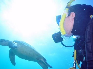 『カメは人になれてて怖がらないで近くにくるけど触っちゃダメ』と言ってたけど、あんなに近づいてくるとは思わなかった・・・。3~4匹のカメが常に近くをまわってたし、息継ぎに浮き上がってくると触れるくらい近くとにかくデカイ。