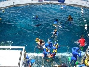 シュノーケリング可能なエリア(ひもで仕切られているんですが・・・)も狭かったような・・・。日本人スタッフは2人いらっしゃいましたが、とても親切で好感がもてました。ポーツーンにはシャワー室や着替えルームなどもあり、かなり機能的にも充実していたように思います。
