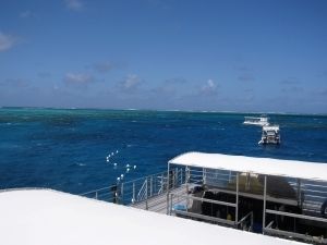 船は、ポートダグラスから出港します。船が沖に出ると雨が上がったので、船の一番上の風の良く当たる所で景色を見ながら、どうにか気持ちが悪くなる前に着いてくれました。さすがに大きい船なので吐いてる方はいないようでした。
