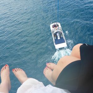 約50分船に乗ってグリーン島まで。島に着いて最初にパラセーリングをしました。事前に予約をしようとしていたけどiPhone持ち込めないとの事で断念していました。しかし、デジカメを借りて写真を(iPhoneの人はエアドロップして)貰うことが出来ると聞いて船の中で当日予約しました!※写真を貰う際は$60ほどかかりますが、何枚とっても同じ値段です!