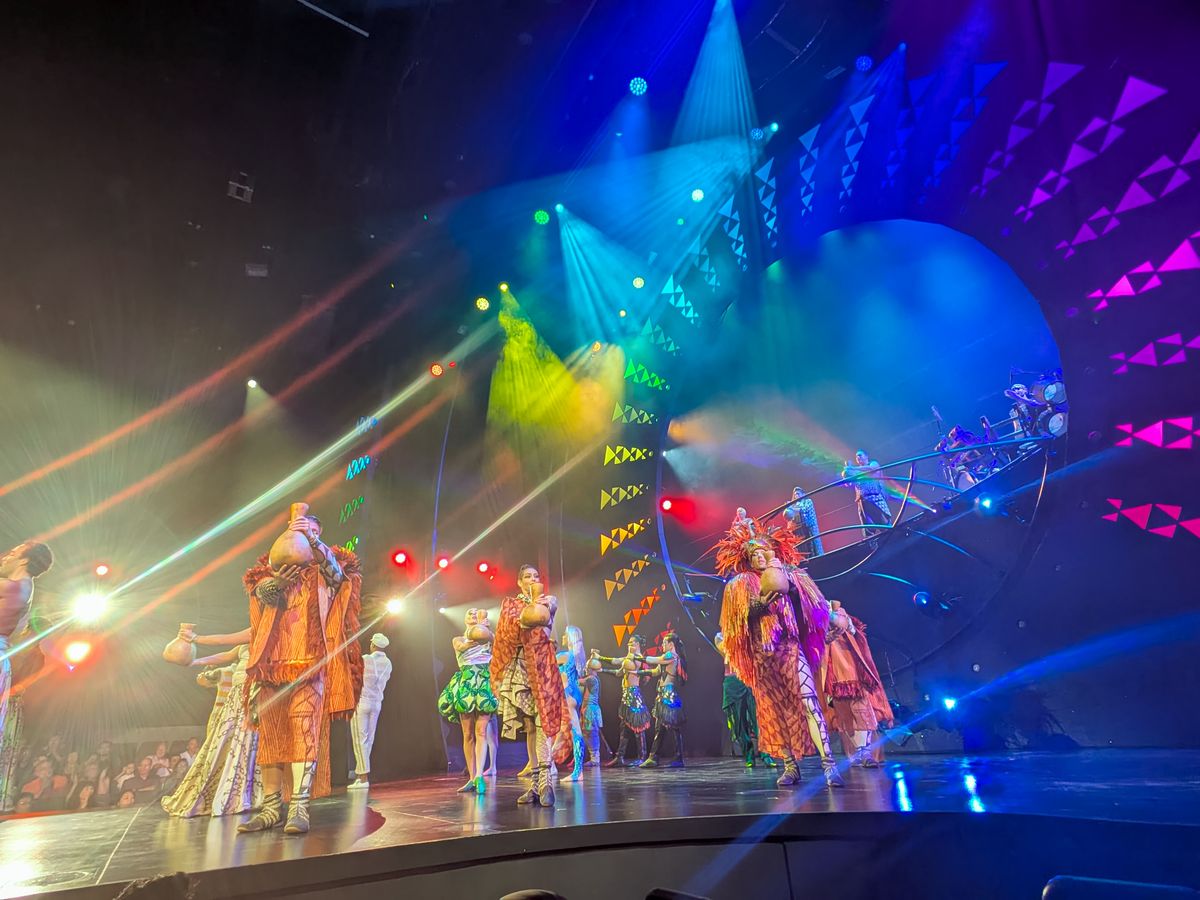 とにかく感激しました!舞台は思っていたより小さくて観客との距離が近いのと席の間を演者の人たちがすごい通るので後の席でも十分楽しめる感じです!私は一番前の席にしましたが隣の席に演者の人が座ったり舞台の布が足に触れたりと臨場感がすごかったです!サーカスというか身体能力がすごくないと出来ないミュージカルという感じでしょうか。演技演出歌音楽肉体美…盛りだくさん!かなりお勧めです!ほんとに行って良かったです!