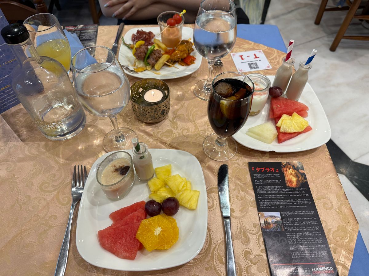 ビュッフェスタイルのお食事はスペイン料理を万遍なく楽しめるものでした。フラメンコショーはその迫力に圧倒されました。男性のフラメンコを見るのは初めてでしたし、ギターの演奏や歌を聴くと本場ならではのムードに包まれました。
