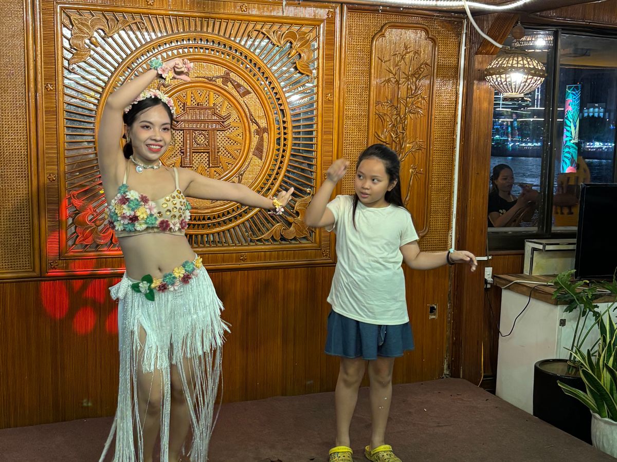 船が進み始めると料理が運ばれて来て、美味しく頂いてると、ダンスが始まり、夜景と、ダンスと料理と大変満足してたら、いよいよロン橋のドラゴンの口から火と水が吹き出しダイナミックでした。