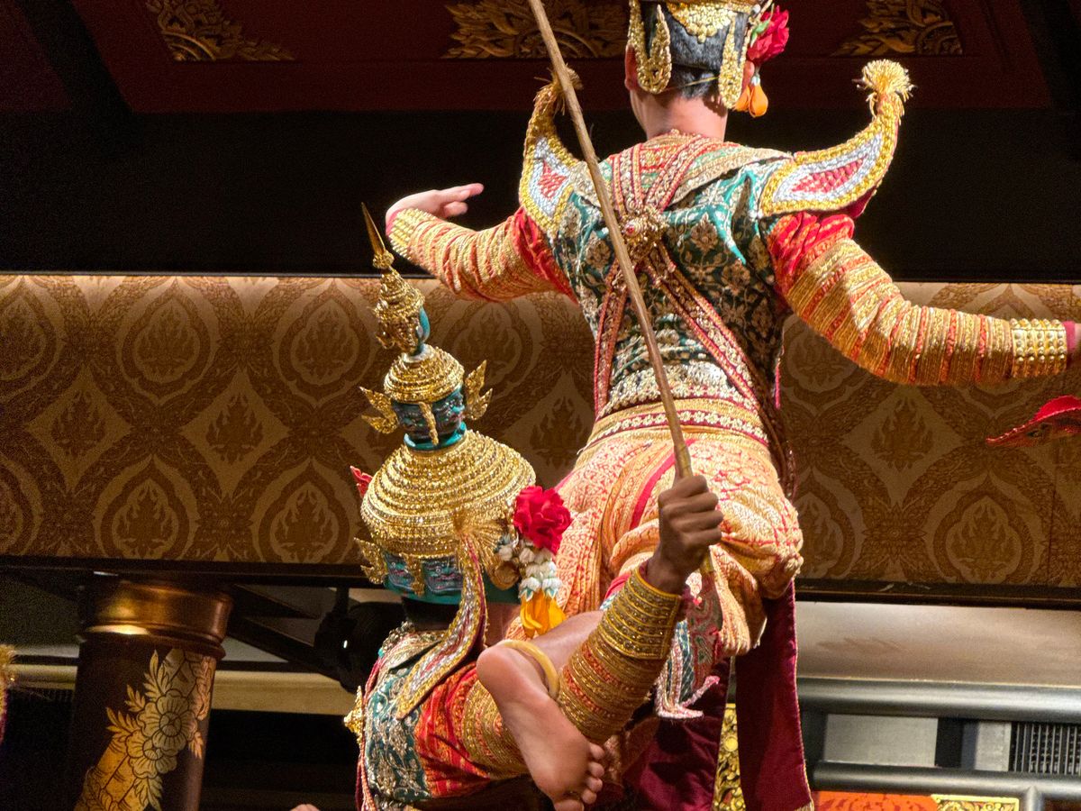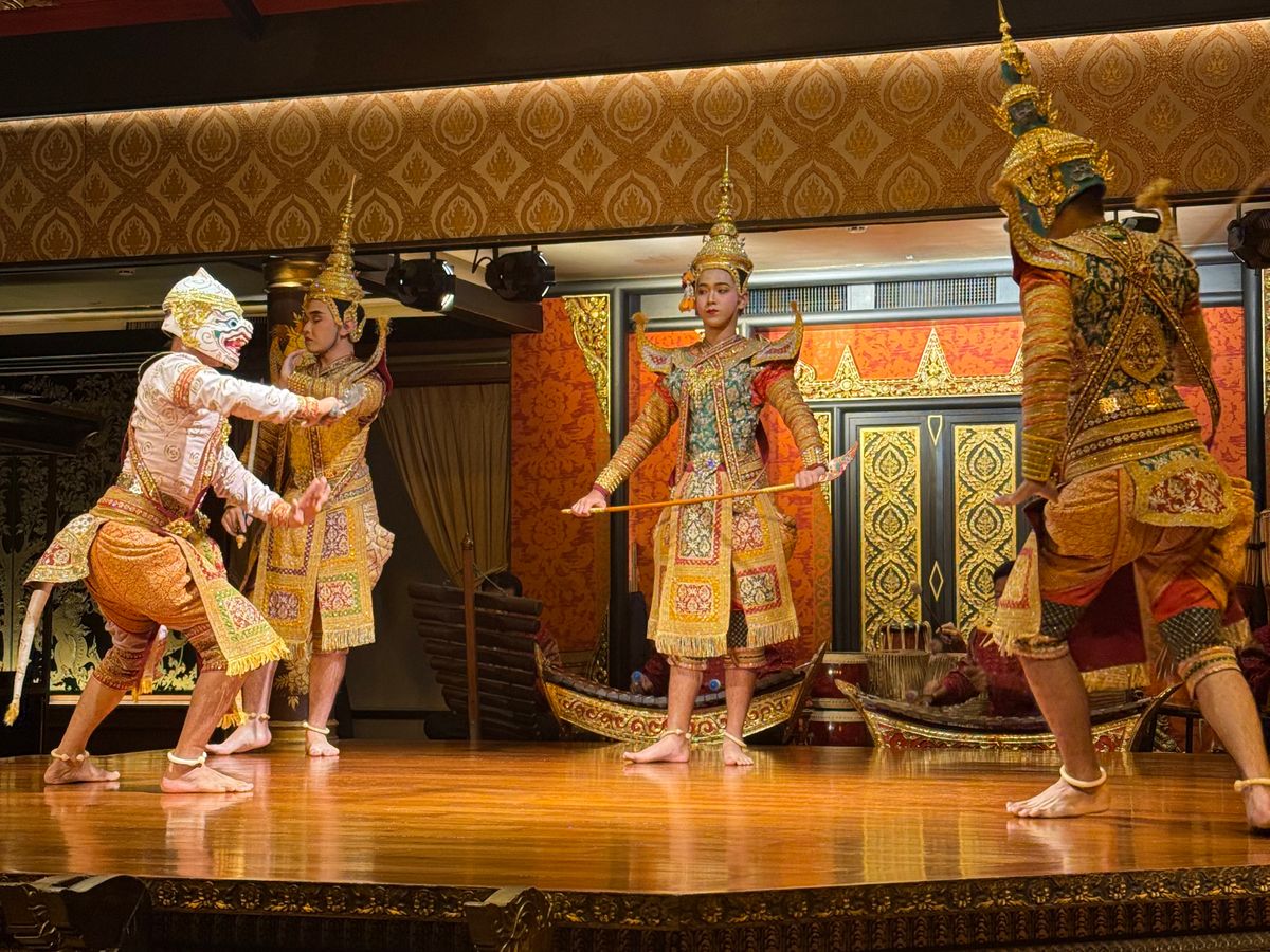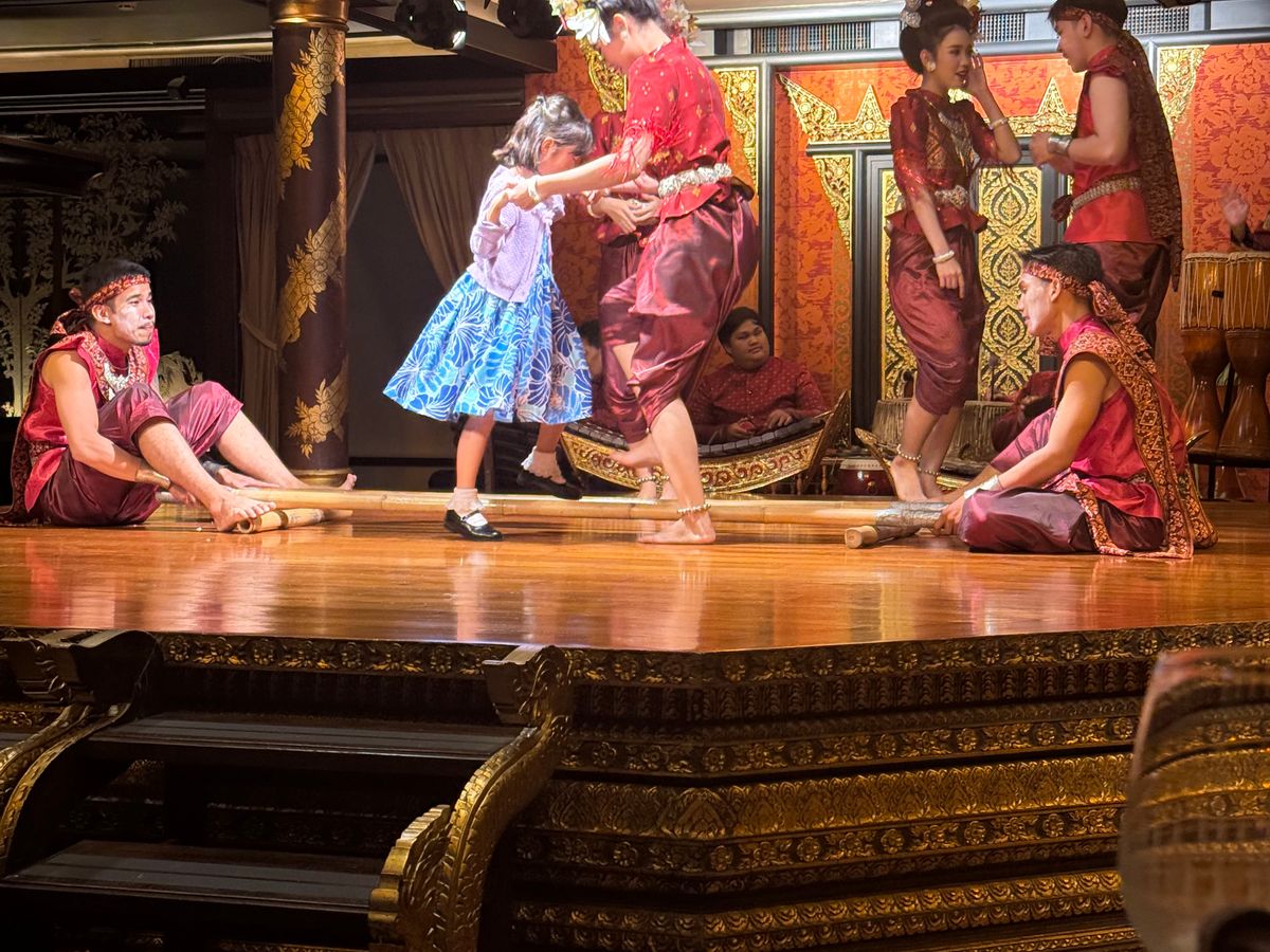 マンダリンオリエンタルホテルから専用ボートに乗って対岸のレストランまで行きました。舞台を囲んで掘りごたつ式のテーブルに座り、コース料理を堪能しながらタイ舞踊を目の前で観覧する事が出来てとても優雅な時間を過ごす事ができました。子供もいたのですが食事も子供のメニューにしてくれて辛くない料理で、デザートも自分でトッピング出来るココナッツアイスクリームが出て、とても楽しめたようです。