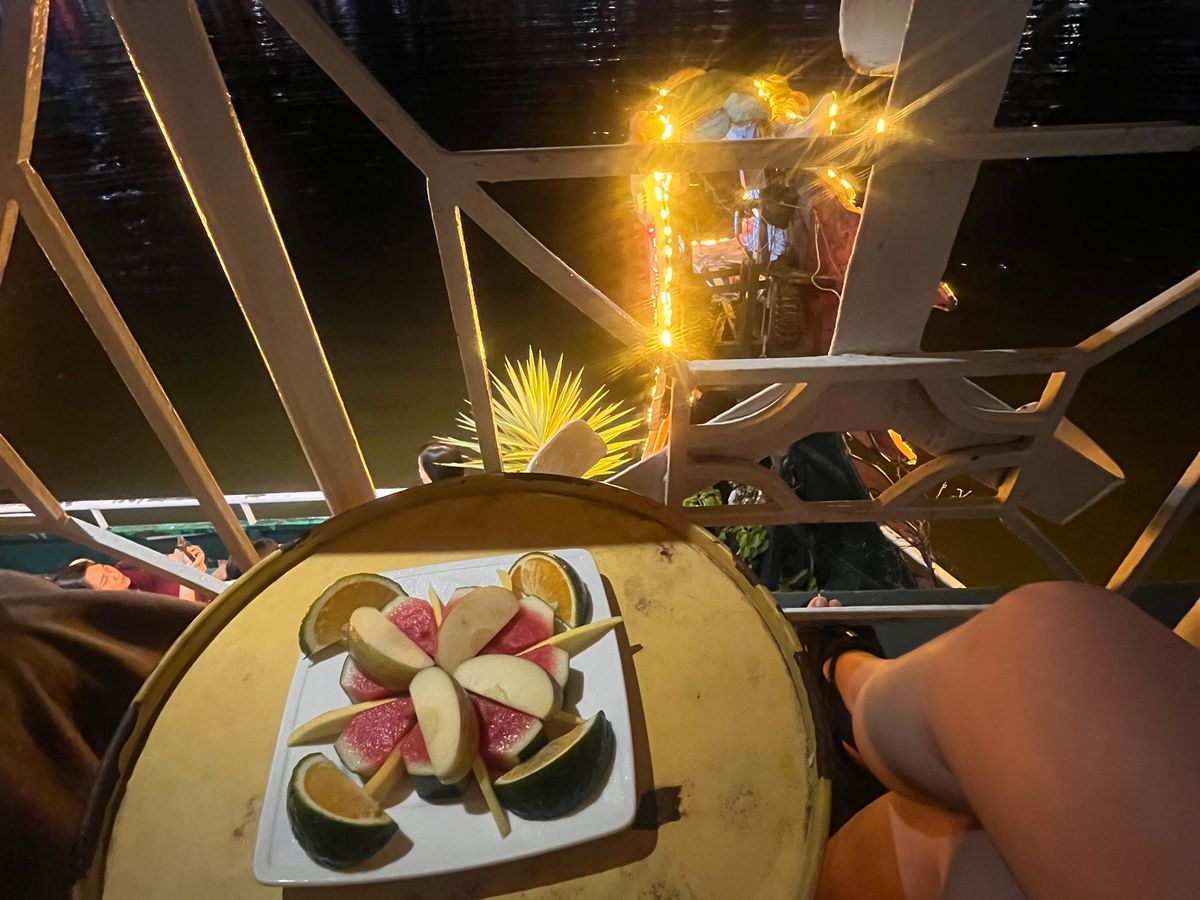 船の中のスタッフさんもとても気が利き、最後に出るフルーツの事を忘れて甲板にでて外を見ていると、外までフルーツを持ってきてくださり、更に椅子とテーブルも外に用意してくれて、風に当たりながら外でフルーツをいただくことができました。