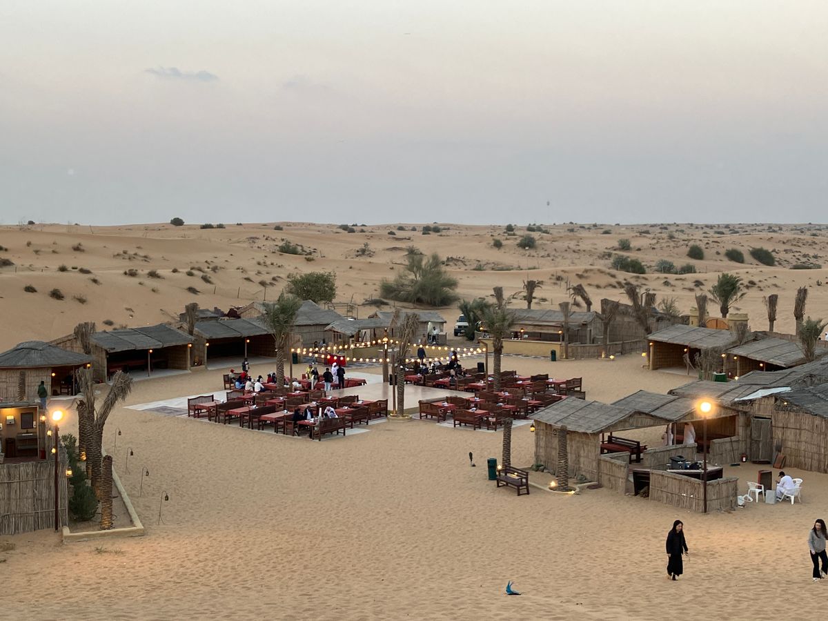 その後はかなり暇な時間が続きます(1時間くらい)。その間に、ヘナタトゥーとかをやってもらうという感じです。サンドボードは丘の上にボードが放置されており、使い方もわからなかったので誰もやっていませんでした。シーシャは私たちが到着した時は、シーシャのブースにはシーシャが置いてあるだけで誰もいなかったので使って良いのかや使い方もわからず結局やりませんでした。もしかしたらその後やれたのかも?鷹匠?は結構後の方に登場したので、めんどうで、こちらも写真を撮りませんでした。私たちはお土産屋のブースを見ていたり座ったりしていました。ここのお土産屋の人は、そこまで押し売りがひどくなく、買わないという意思を伝えたら諦めてくれました。その後ステージの周りのテーブルに案内され、(なぜか私たちとインド人のおじさんが同じテーブルで気まずい)少しすると、音楽が流れ始め、まずは杖を使ったダンスが始まります。ひたすら同じ動きを繰り返すのみで、誰でもできるように思えるのですが、なぜかそのゆるさがクセになります。(あまり盛り上がらないので若干気まずい)その後は、デカいスカートで回るダンス?、ファイヤーダンス、ベリーダンスの順です。ファイヤーダンスは盛り上がるのですが、他のダンスはイマイチ盛り上がらず、演者にも若干申し訳ないと思いました。(陽気な外国人がツアー客にいたら盛り上がるかも)。ダンスが終わると、ビュッフェが始まります。BBQは特に美味しかったです。どの料理も余っていて、売り切れていで食べれないということはないと思います。ビュッフェを食べた後は、アナウンスが流れ、終了の合図です。ガイドの方が、他の団体よりも早く一番に声をかけてくださったので、私たちの車は一番にキャンプサイトを出発し、21:30〜22:00には帰宅することができました。食事後は、早く帰りたかったので、地味にこれがありがたかったです。