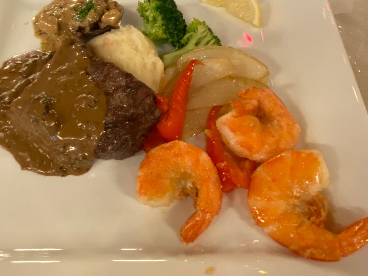 食事はボリュームもあり期待通りの美味しさでした。アルコール2杯付きで十分な内容でした。4名掛けの席でドイツからの新婚さんと一緒にお話ししたり交流もでき、楽しむことがでしました。フラダンスや目の前で観るファイヤーショーも最高でした。
