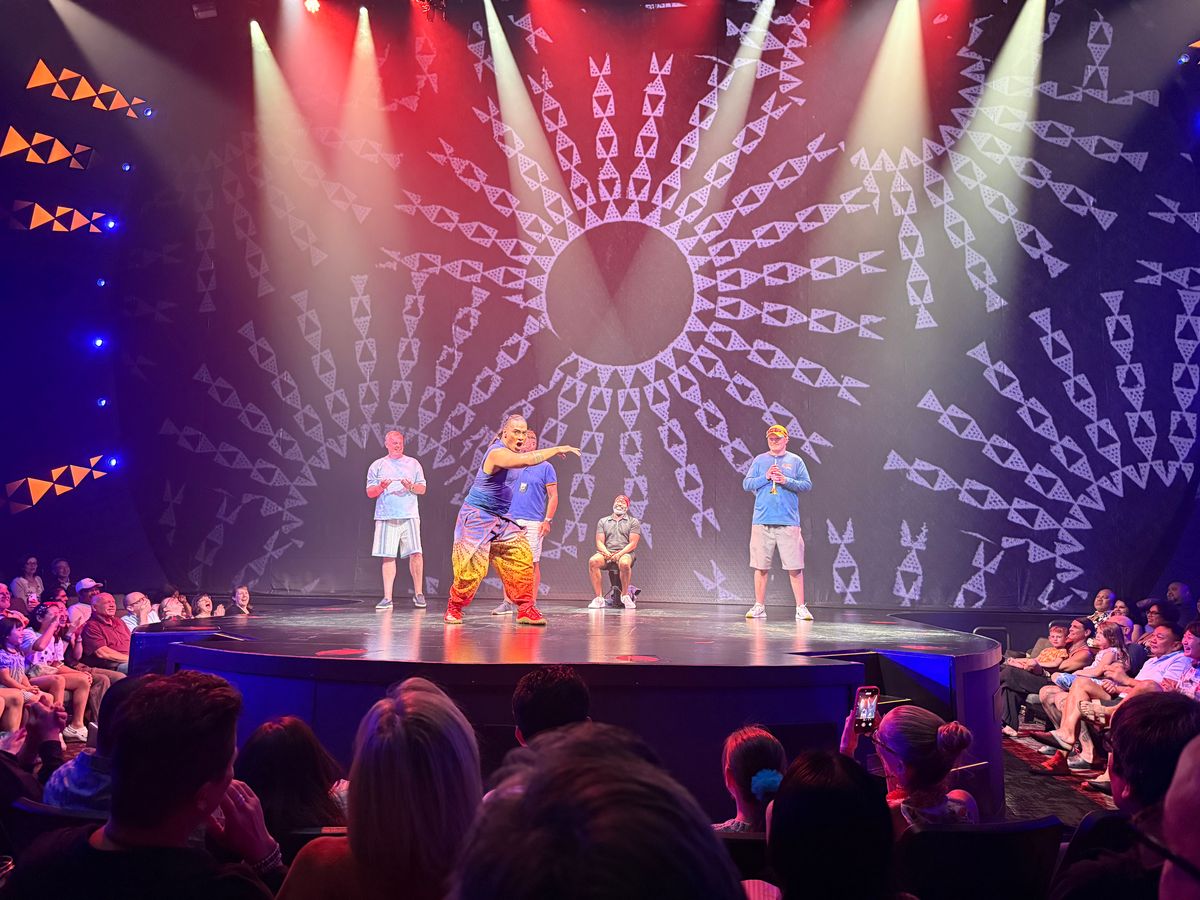 This is a non-traditional show set in a large, comfortable amphitheater on the top floor of a shopping plaza. The show opens with a short historical video about the land and people of Hawaii set in 1920, which sets the timeline for the rest of the performance. From start to finish, the show runs about 1 hour and 10 minutes—just the right length in my opinion.