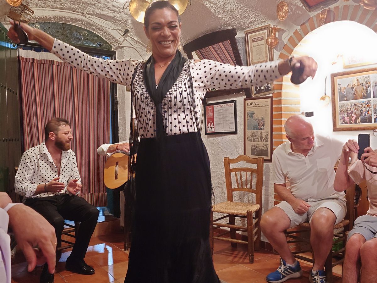 サクロモンテバス停真ん前でアクセス抜群、入場は40分前からで、手前側から詰める先着順。一番乗り〜15番目くらいまでに入ると真ん前で踊りが見えて、衣装が触れるほどで臨場感が抜群、価格もお値打ちです。構成は他と同様でバイレ3人、ギター、カンテが各1人。とても良い経験、アジア、日本人は僕だけでした