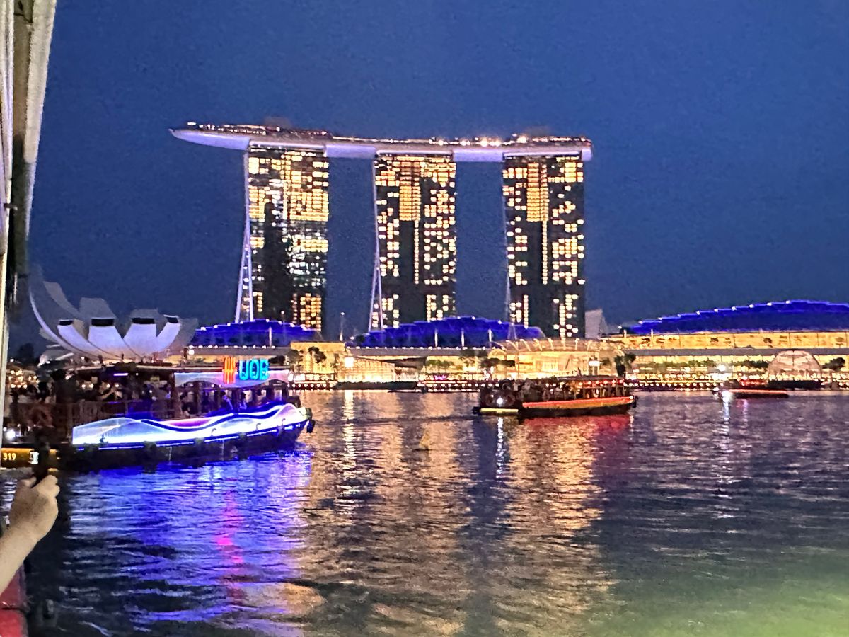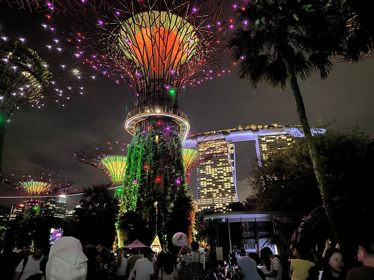 6:40ロビー集合、30人近く引き連れて人混みの中を早足移動。前の人を見失わないやうに必死に着いて行きます。時間がタイト。船をおりてショーの開始まで数分しかない、場所とりはできず、みんなが掲げるスマホの隙間からようやく見る感じ、8:15からガーデンズへ早足移動、タクシー乗り場案内のため遠回り、そのためショーが始まって数分してようやくツリー付近に到着。土曜日ということもあって大混雑ということもありましたが、結局、10時からの噴水ショーをもう一度自分でみて満足しました。暗くなってようやくランプのついた棒を掲げてくれましたが、ガイドさんを見失ったらおしまいという感じでした。もう少し目立つ格好をしてくれたら、と思いました。