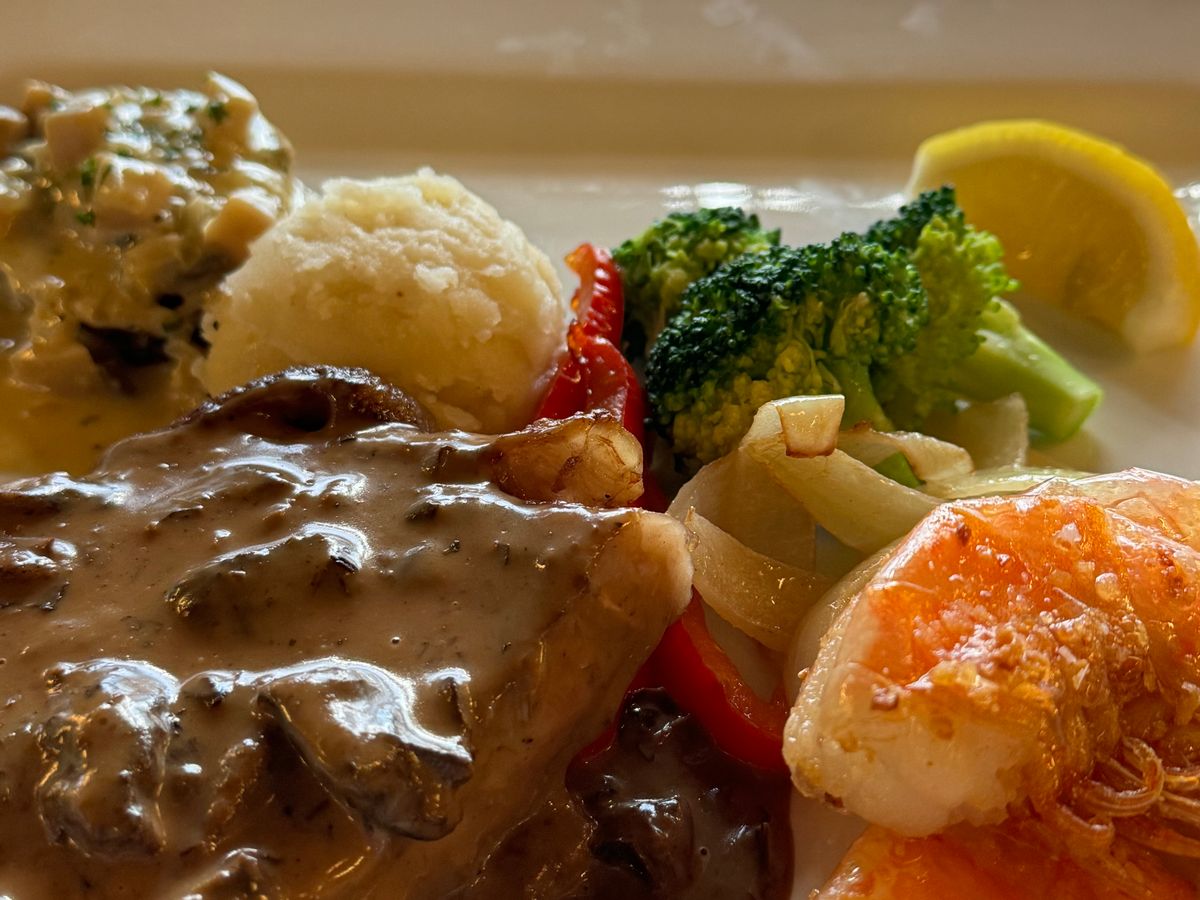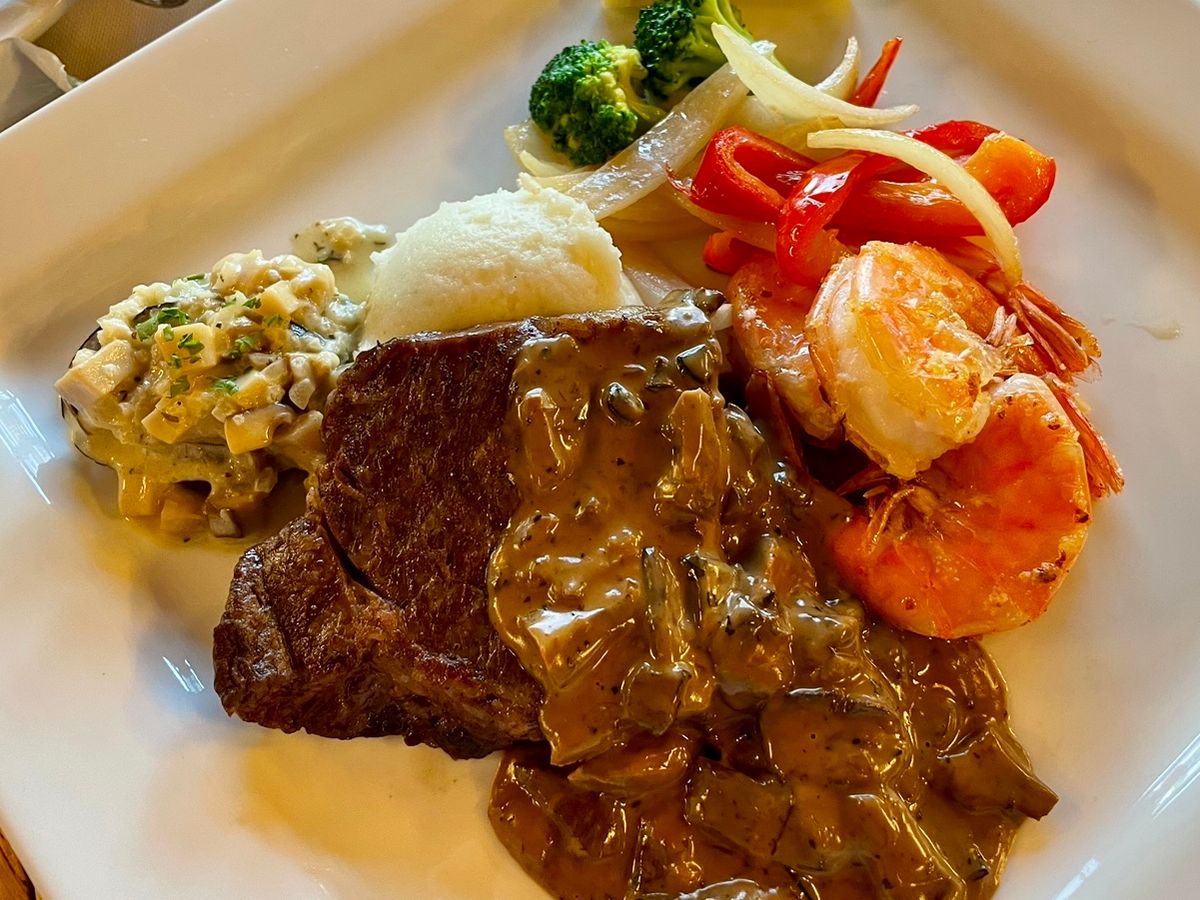 メインはステーキにガーリックシュリンプにアワビも出てきてうまかった。