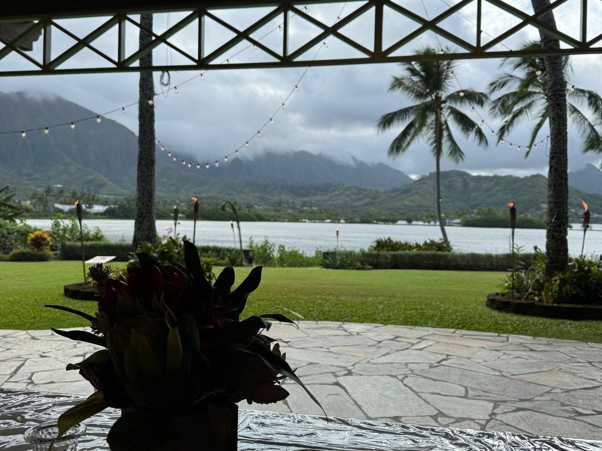 会場はカイルアの池沿いにあるプライベートガーデン。チャペルもあり結婚式も行うところらしい。ワイキキとは違い自然に囲まれた落ち着いた雰囲気。食事の場所は屋根付きの屋外で風が心地いい。