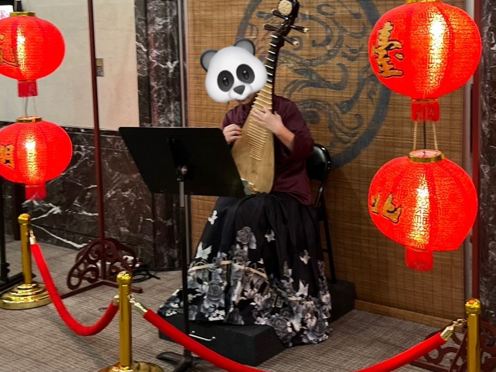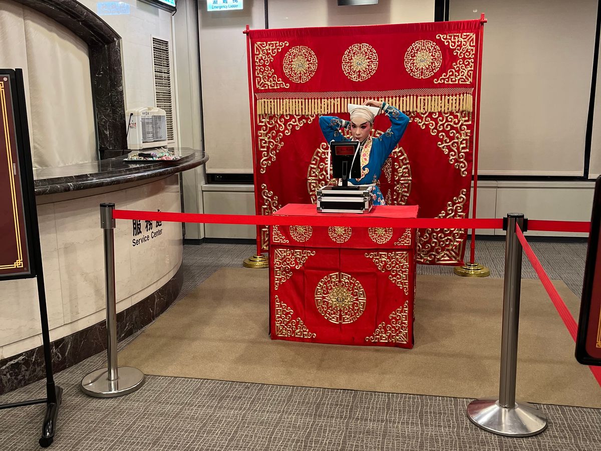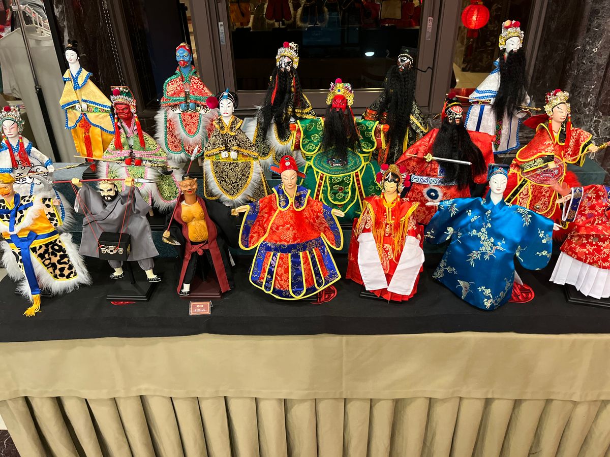 指人形や小物など観劇のお土産コーナー、演者さんの化粧前風景、様々な京劇の展示物、琵琶の演奏、実際に豪華な髪飾りと衣装を着付けての写真撮影などで楽しませてくださいます。私たちは、30分ほどブースを回って先に座席に戻りました。