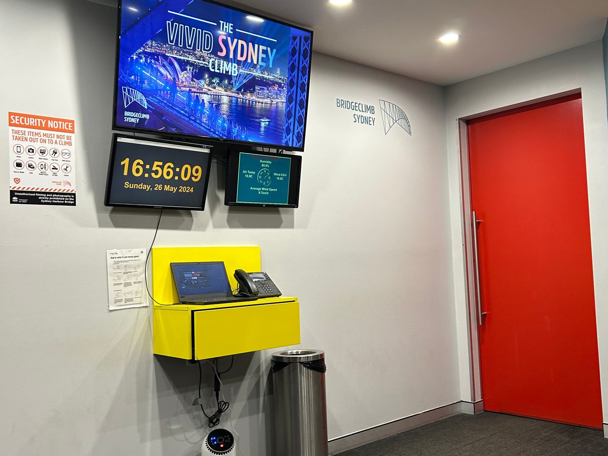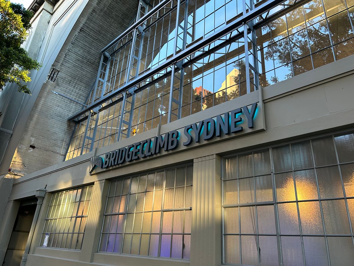 夜景が普段以上に輝くビビットシドニー開催中を狙って申し込みしました。夜の部は16時40分に受付、健康上の注意事項確認と誓約書のサインを済ませて、55分からビデオによる説明と自己紹介タイムがあり、ツナギに着替えてハーネスを装着。垂直に近い階段で簡単なトレーニングを行った。ここまで約40分くらいかかりました。それからビビットシドニーのライトが灯る瞬間を見てからロックス側の橋脚の内部の梯子を登っていきました。これがキツイ!30段くらいの垂直梯子が互い違いになっていて、合計で200段くらいを一気に登ります。手すりが所々切れている部分で体を左右に動かして登らないといけません。一瞬片手で体を支える時が恐怖でした。足を滑らしたらそのまま落ちてしまいます。これ、落ちた人過去にいると思う。その恐怖を抜けると橋の上のアーチの部分にでます。ここははじめはカーブがあるので階段上りが辛かったですが、3分の1を過ぎてからはカーブが緩やかなので楽になります。ビルから発せられるレーザービームが七色だったことは、橋の上だからわかったことで、ヨットハーバーの地上からは色の区別がつきません。途中の写真タイムは3回✖︎3ポーズあり、ガイドさんのカメラの腕も良く、予想していた以上の笑顔の写真が取れて大満足、テッペンの部分で少し休憩もあり、夜景を堪能できました。でも、最後にまたあの橋脚部分の梯子下りが、、、。なんとか下りきり、服やハーネスを参加者同志で外して、笑顔でお疲れ様の挨拶、写真の確認をして支払い(57ドル)を済ますと1枚だけ選んでプリントしてくれます。記念の緑の帽子とドリンク券を貰って終了です。終了時刻は20時でした。慌ててトイレに駆け込んではほっとしました。50代の女子にはキツい体験でした。ドリンク券で飲んだクラフトジンサワーがとても美味しかったです。それにしてもツアーガイドさん、3時間ずっと喋り通しの上、急な橋の上を行ったり来たり、参加者への安全確保や、カメラマンの役割、1人で何役も大変そうでした。途中のポイントでも、他のスタッフさんが狭い場所でずっと見守りをしていて、頭がさがりました。ありがとうございました。