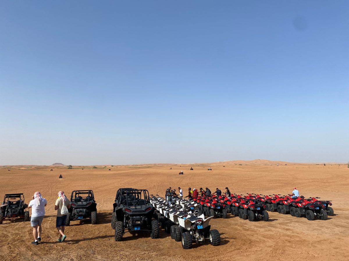 砂漠のドライブ、ラクダ乗り、ハヤブサ乗せ、バーベキュー、ショー見学など全て合わせての値段としてはかなりコスパが良いです。ホテルでピックアップしてくれたSUVドライバーが、砂漠をドライブする特殊なライセンスを持っており、そのまま、その車で砂漠を爆走します。途中、タイヤの空気を抜くために、マーケットの様なところに寄り、希望者は有料で四輪バイクを体験できますが、乗らない人には物売りなどが溢れる中で、何の説明もなく無駄な時間を過ごさなければいけないのが少々難点で、有料のラクダ乗りなどもあってこれが今回のアトラクションの一部かと勘違いしてしまう人もいるかも知れません。