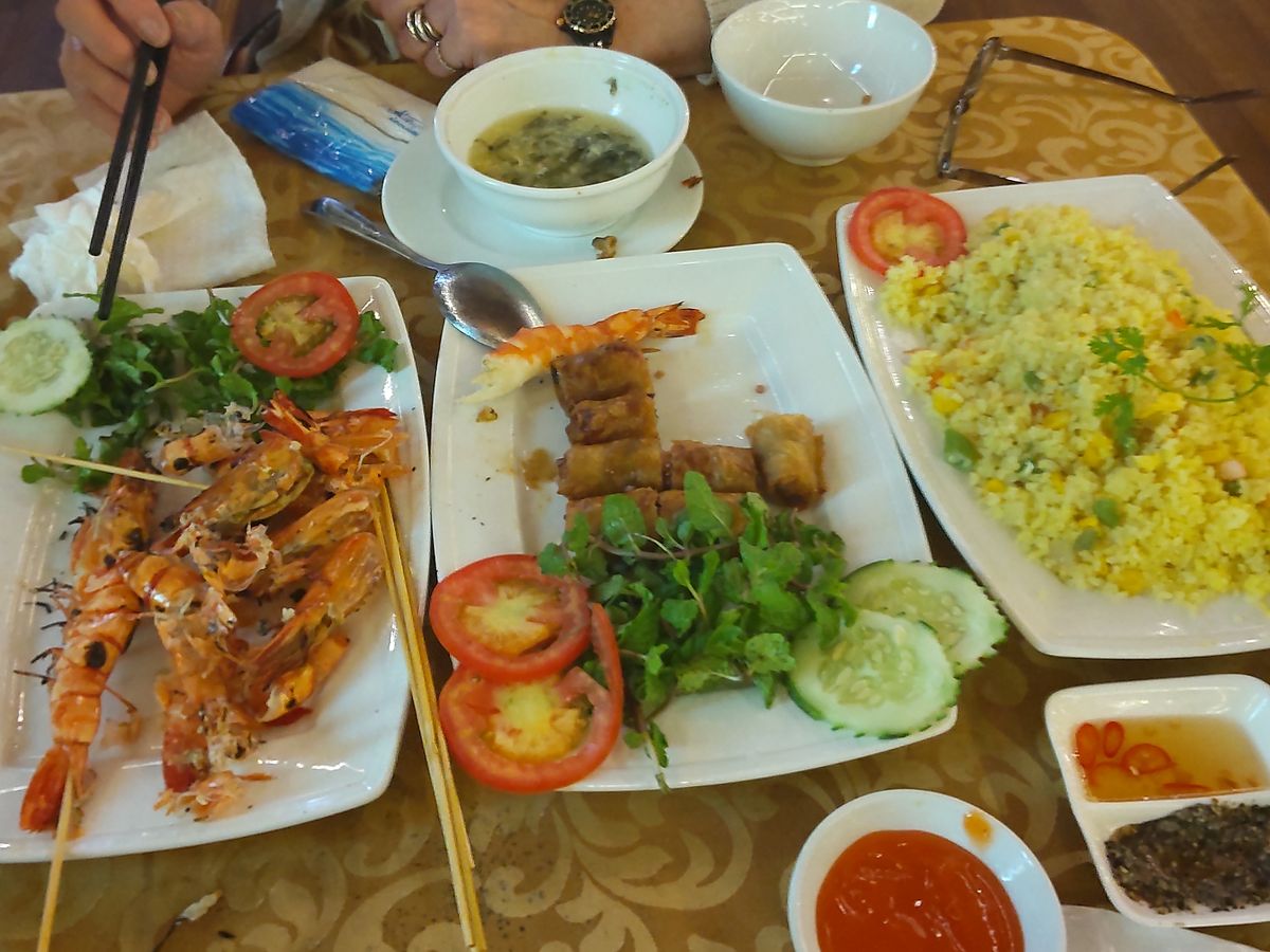 ②観光遊覧船のりばから、タウロンソンハン号に乗船。2階の食事会場へ。僕らは二人だったので二人のテーブルが用意され、ガイドさんがドリンクの注文までしてくれます。この船着き場から出る船は、この船だけでなく40から50隻の船が出ます。お料理はエビ串焼、空芯菜炒め、スペアリブ焼き、カニと海苔のスープ、上げ春巻き、ベトナム風チャーハンで食べきれないほどでました。日本人にも食べやすかった。ライムが入ってる塩が使いやすかったです。最後はとても甘い、スイカとりんごのデザートが食べ切れないほどでました。一緒に出てた、カブか、大根かと言うような食感と少し酸っぱいフルーツはこれだけ合わなかったけど。