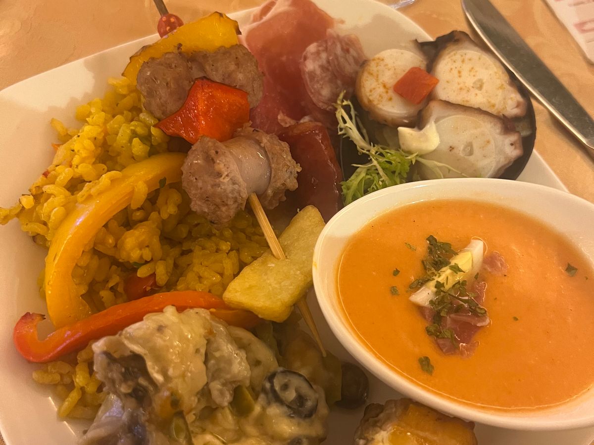 ブッフェの食事はまぁまぁ楽しめた。ディナー客はショーを前列で見られる、とWebの体験談で調べていたので、ステージ前最前列で鑑賞できた。マドリッドのタブラオで鑑賞した経験があるが、ここではソロを盛り立てるような演出でありまた違った雰囲気で楽しめた。お値段は日本の感覚だと高いように感じるが、現地で食事をとってみると分かるが円安の影響が大きいだけで、さほど割高には感じられない。Barcelona Card を購入すると現地で割引チケットを購入できる(予約できるかは不明)そうなので、少しでも安くしたい人は調べるとよいかも。
