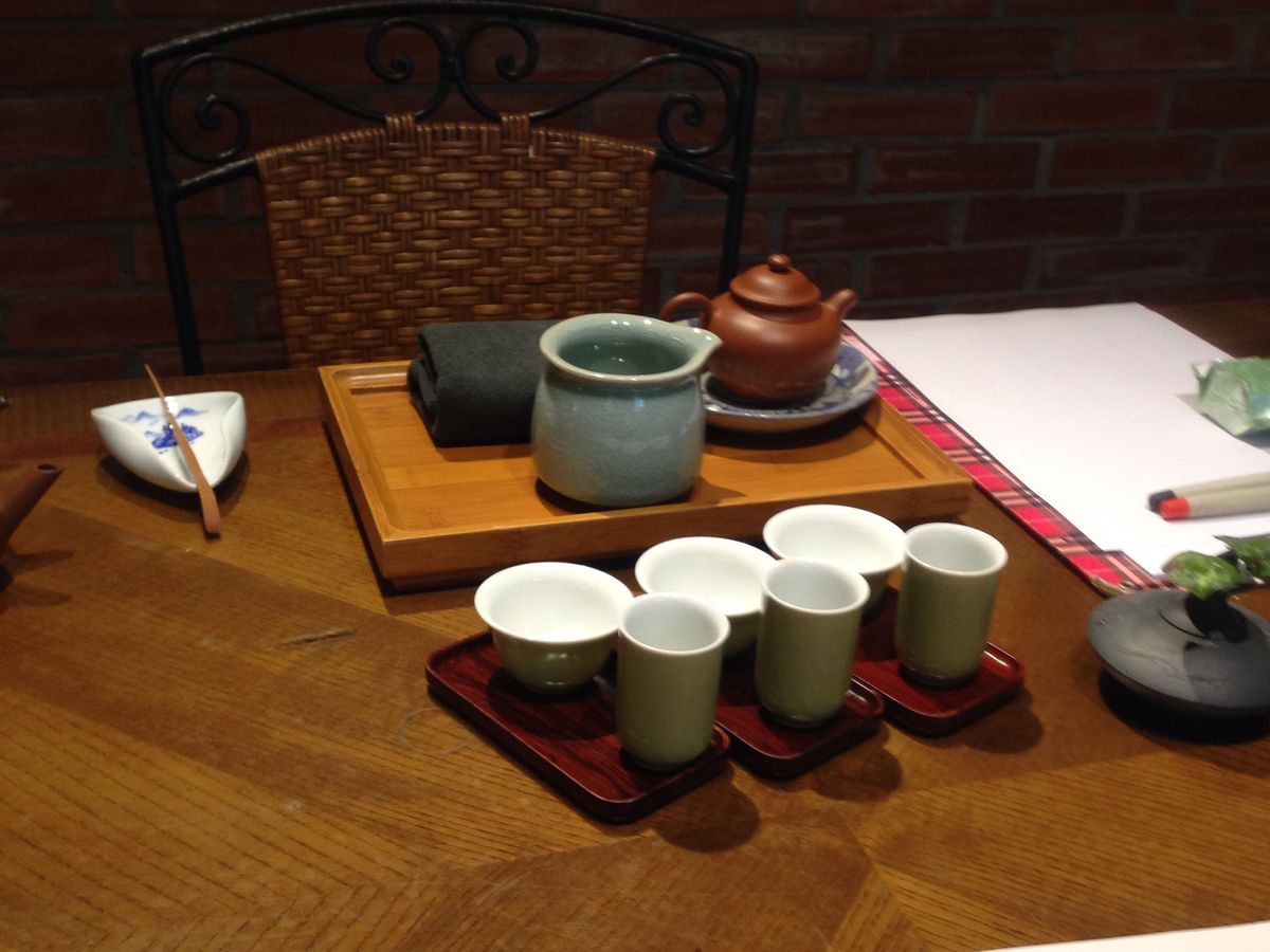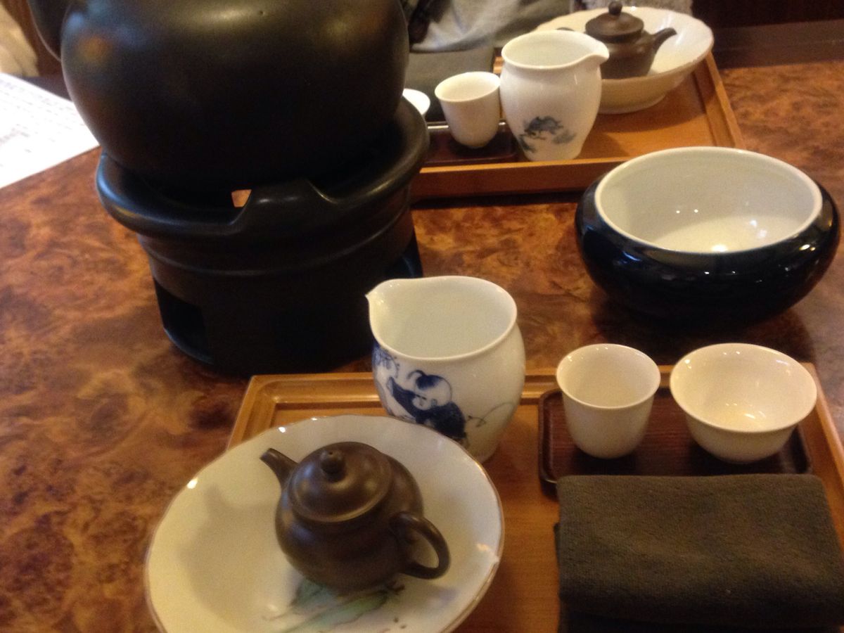 前半は簡単なテキスト(日本語)を元に、先生からお茶の種類、茶器の種類、茶葉の保存方法などについて教えてもらい、その後実際に茶器の持ち方や杯の使い方、茶器の洗い方などを実演してもらいながら学びます。
