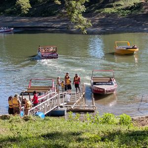 ボートに乗る前に救命胴衣を着けて、川に歩いて降りて行き、ボートに乗ります。