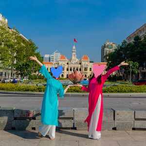 アオザイは、淡い黄色のものと明るい水色の2着が届きましたが、写真を撮った時に目立つかなと思い水色にしたところ、鮮やかでホーチミンの街並みと合う素敵な写真になりました。