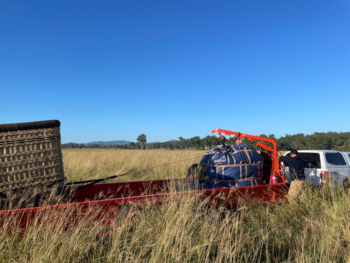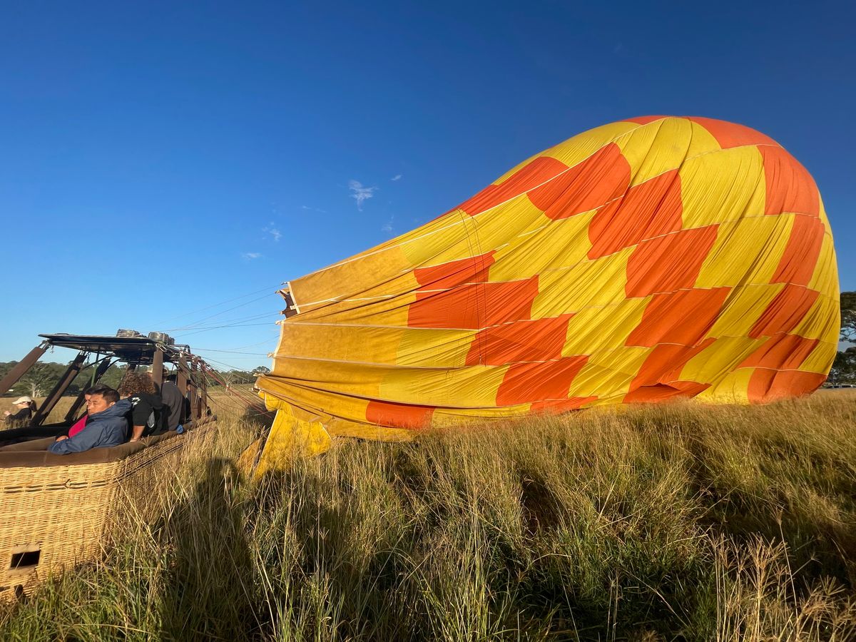 面白い体勢でランディングした後は、みんなで気球のお片付け。気球の空気を抜きながらの作業では、足元がビショリと濡れます。これも貴重な体験でした。