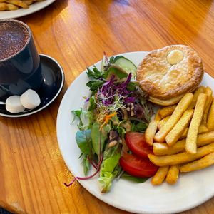 ランチはスープ、野菜の添え物、メイン(チキン、ベジタリアンパスタより選択)、デザート(チョコレートケーキとカットパイナップル)、コーヒー。テーブルには赤ワインボトルがあり、お願いすればおかわりできました。