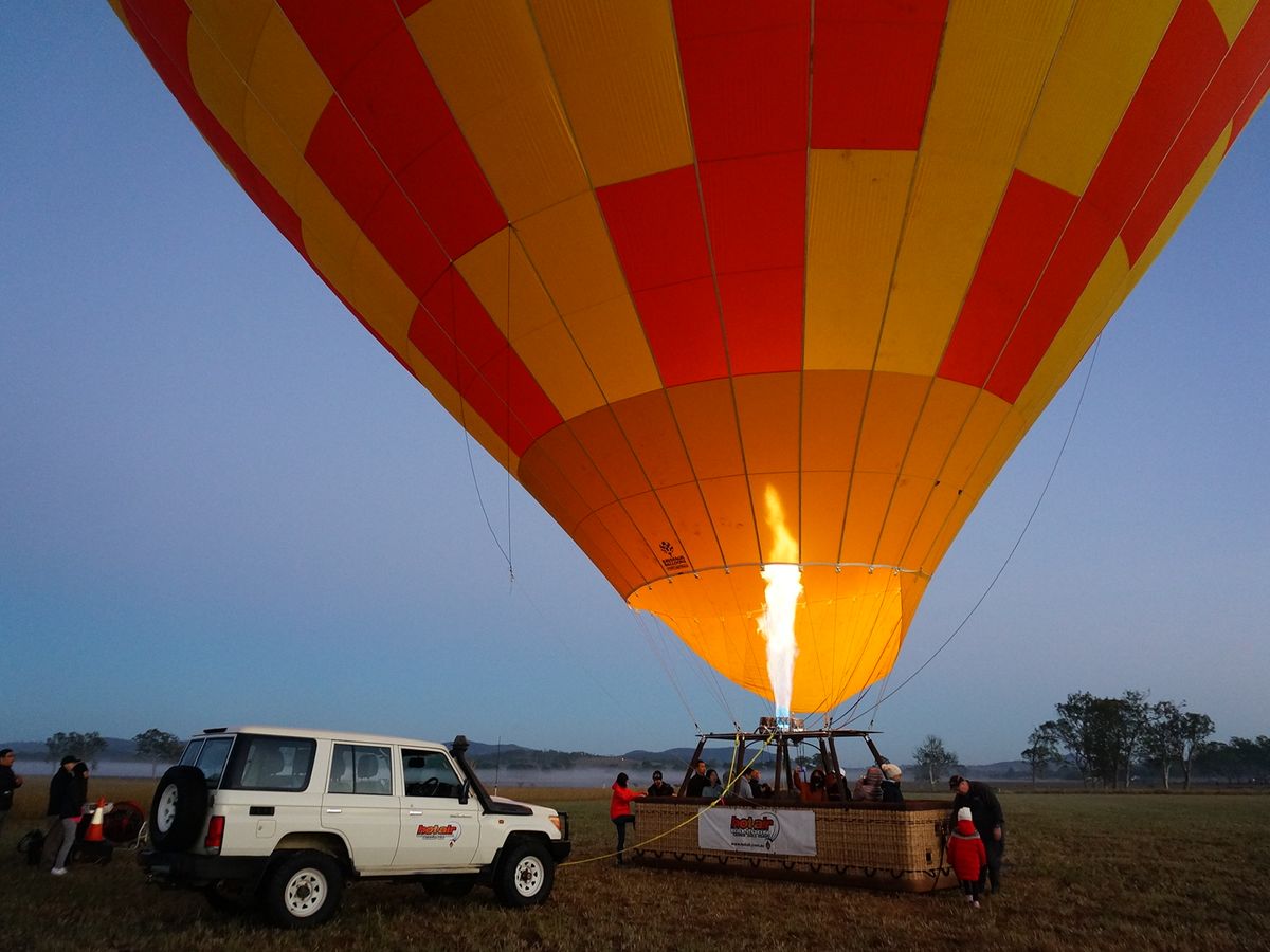 初めての熱気球だったのですが、今回のオーストラリア旅行の中で1番の思い出となりました。朝の4時ごろにピックアップで、とても寒く、季節も冬だったので厚手のパーカーにアウターを着ていきましたが正解でした。バスの中では日本語のDVDでの説明もあり、安心できました。しかし、ドライバーやスタッフの方はすべて英語での説明で、日本人も私たち2人のみでした。バスで移動後、広い野原のようなところで近くで気球に火を当てている様子はとても迫力があり、乗る前からワクワクしました。近くに野生のカンガルーもいて可愛かったです。離陸するときもフワッと上がりゆっくりと登っていきました。なんといっても気球から見る景色がとても素晴らしく、感動しました。天気も良く、空もクリアで日の出がとても綺麗でした。着陸するときも少し衝撃がありますが、全く問題はないと思います。その後ワイナリーに移動し朝から飲むシャンパンや朝食も最高でした。同じ敷地内にアルパカの農場があり可愛かったです。ただ、終わる時間はいろんなところへ参加者を降ろしていったのでホテルについたのは12時30分ごろになりました。オーストラリアという広大な土地で熱気球に乗ることができて本当に最高の体験になりました。