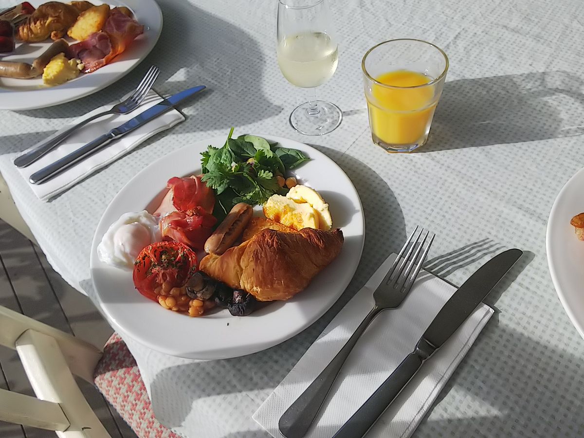 ブドウ畑を飛び交うインコを眺めながら美味しいクロワッサンやベーコン、スクランブルエッグなどを食べ、絞りたてのオレンジジュースも飲むことができます。