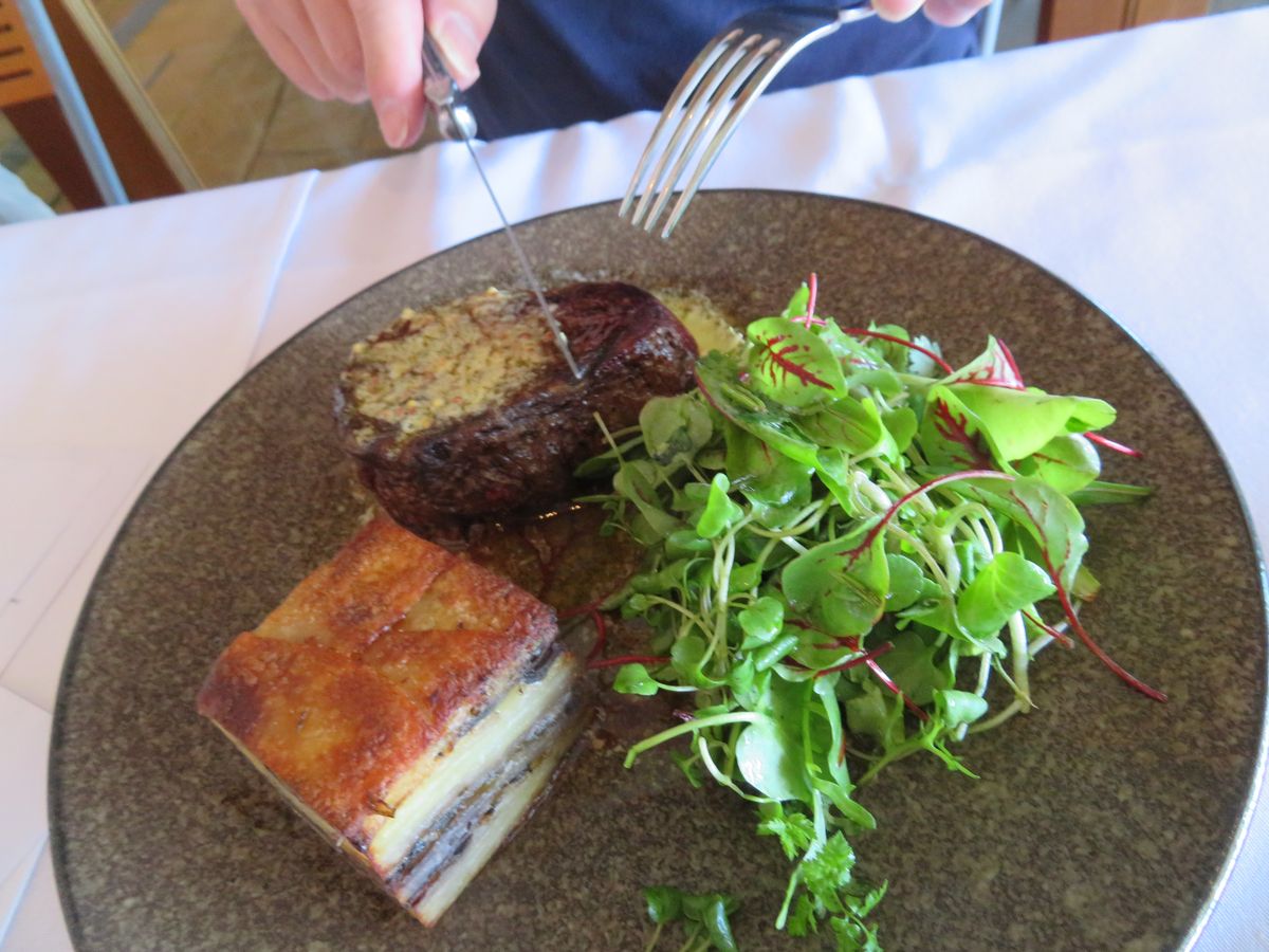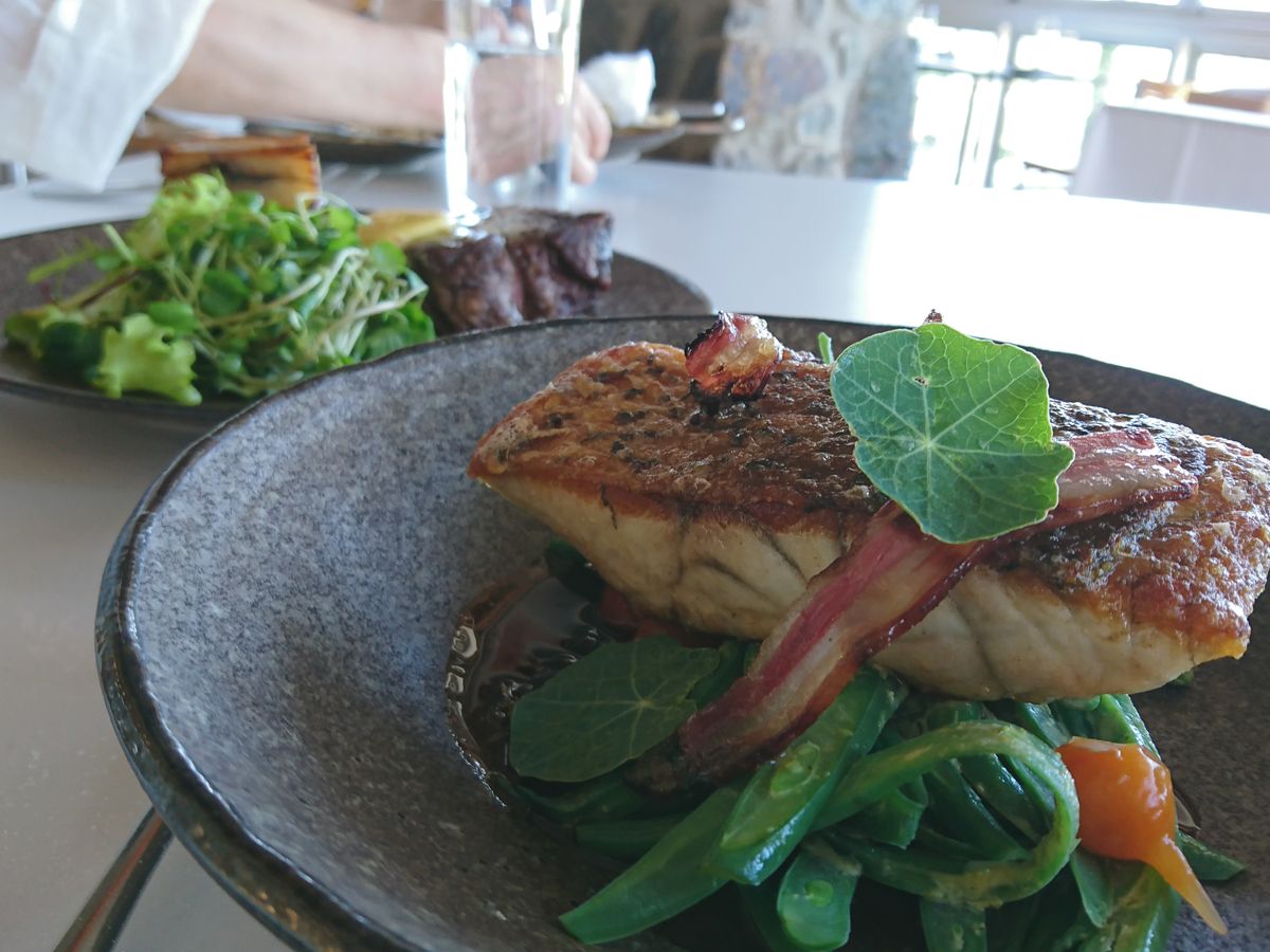 ランチはベストワイナリーレストランに何度も選ばれたことのあるお店ということでしたが、堅苦しい雰囲気ではなく、雄大な景色をみながらゆったりとした気持ちでおいしいお料理をいただきました。息子が前日下痢してぐったりずっと寝ていたのですが、前菜のリゾットがとてもおいしくて、息子も寝ぼけながらおいしそうに食べていました。アンガス牛のステーキやお魚のお料理も焼き加減が絶妙で味付けもおいしかったです!子供の料理は別途注文とあったのですが、調子が悪かったのでデザートだけ頼ませていただきましたが、嫌な顔ひとつせず受け入れていただけました。子供がどんどんぐったりしていきとても心配になってしまったので、プランに付帯のワインを頼んだものの、飲む気分になれなくて途中でジュースに変えてもらいました(レモネードおすすめです)。レストランスタッフの皆さんも優しくて拙い英語でも聞いてもらえて助かりました。食後はソファの席に移って長居させていただきましたが、いろいろなスタッフさんがぐったり寝ている息子を見てお水はいらないか?氷はいらないか?など気にかけてくださいました。