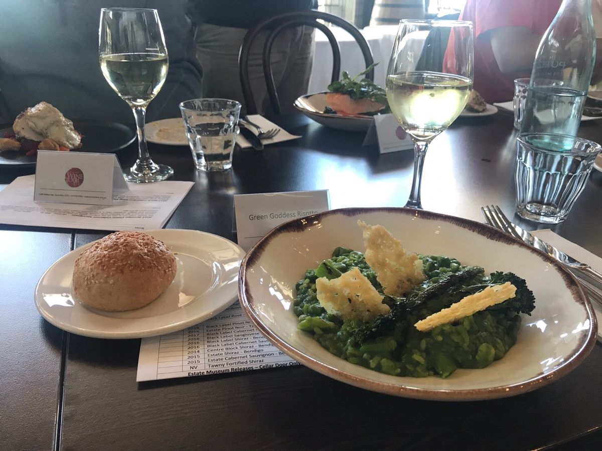 最初のワイナリーでガイドのジョンさんが、テイスティングの仕方を教えてくれます。早まって先に飲まないよう!2軒目のワイナリーでは、テイスティングの後ランチをいただきました。私はポークをカベルネとともに、娘はソラマメやブロッコリーなどの緑色のパルメザンリゾットをシャルドネとともにいただきました。美味しかったです。3軒目のワイナリーでは、ベルトラ特典のギフトワインをいただきました。最後のシャンドンではグラススパークリングを幾つかの中から1杯選び、外のデッキでいただきました。天気にも恵まれ、周りの方とのちょっとした会話も弾み、大満足の1日でした。