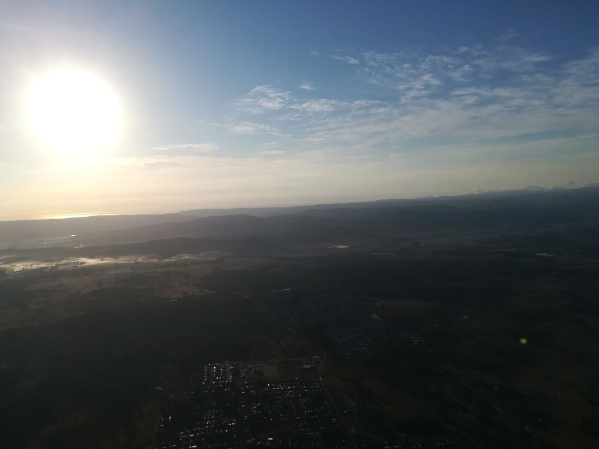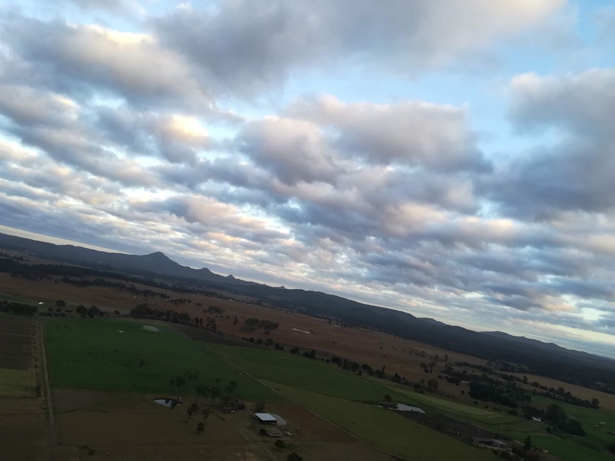 上空からの景色は凄い!!はあ〜と口から息がで、無言で見つめてしまいました。朝日と緑のコラボレーションは素晴らしい!オーストラリアの広さを改めて実感しました。下を見ると牛と羊が黒白の点々であちこちに見えます。