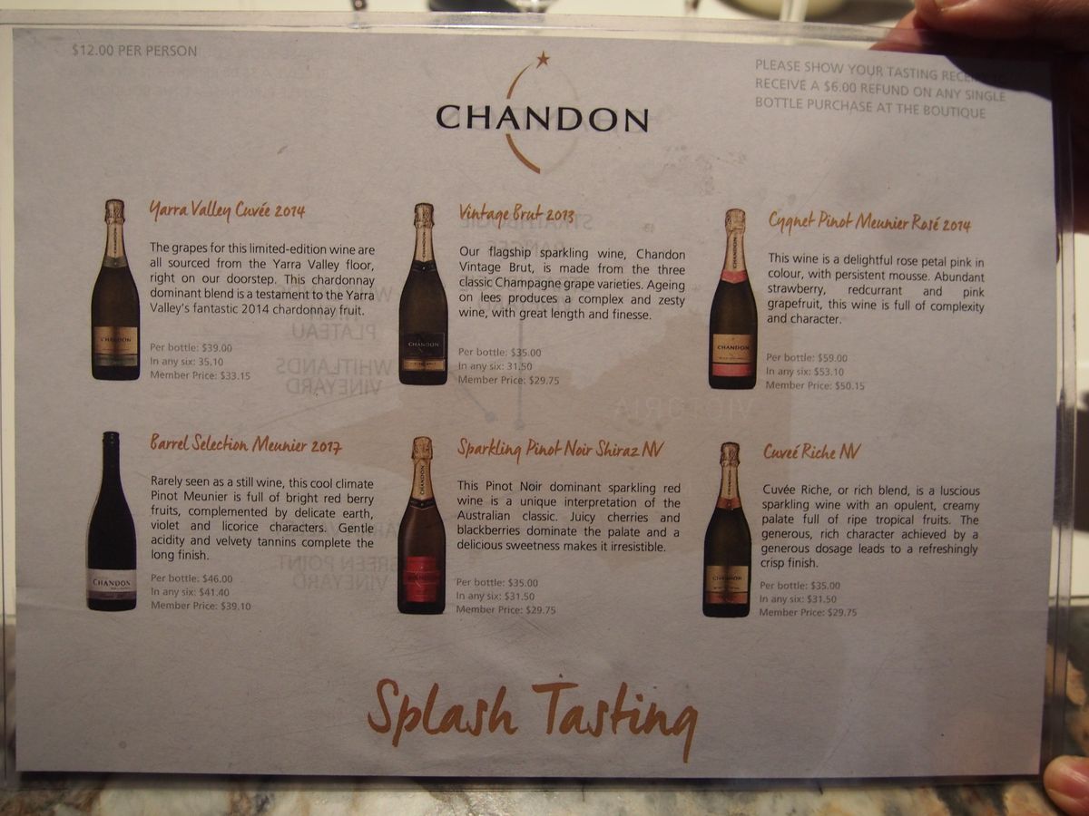 などドライバーさんは、フレンドリーでジョークを交えながら案内してくれました。4つのワイナリーをめぐり、最後のシャンドンでは、シャンパンの作り方を教えてもらい、大きなワインセラーも見られました。グラスいっぱい楽しみました。食事は4つから選べ、おいしかったです。また行きたいです。25種類も飲めました。