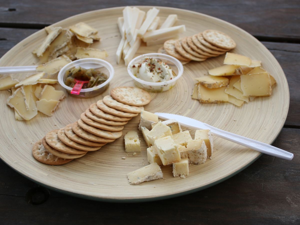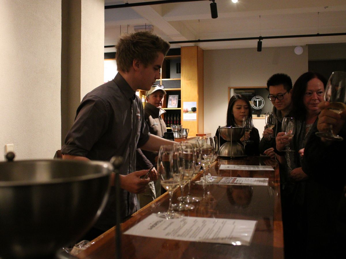 白ワインから始まり赤ワイン、デザートワインへと進み、1種類ずつグラスが空き次第テイスティングさせてもらえます。量はグラスの5分の1程度と少なめ。自由につまめるカマンベールチーズとクラッカーがシンプルかつ美味しかった。飲み残しても、水ですすぐスペースがあります。