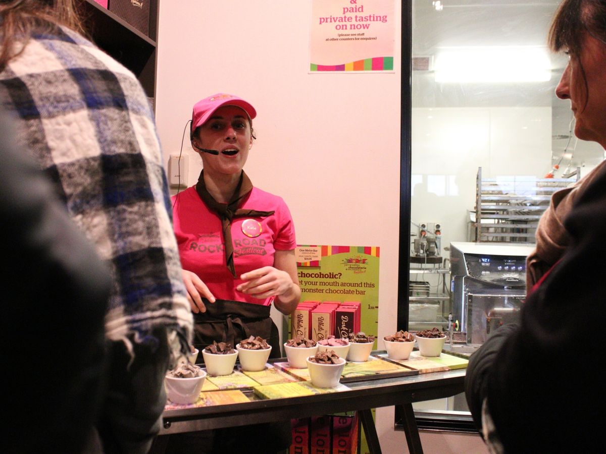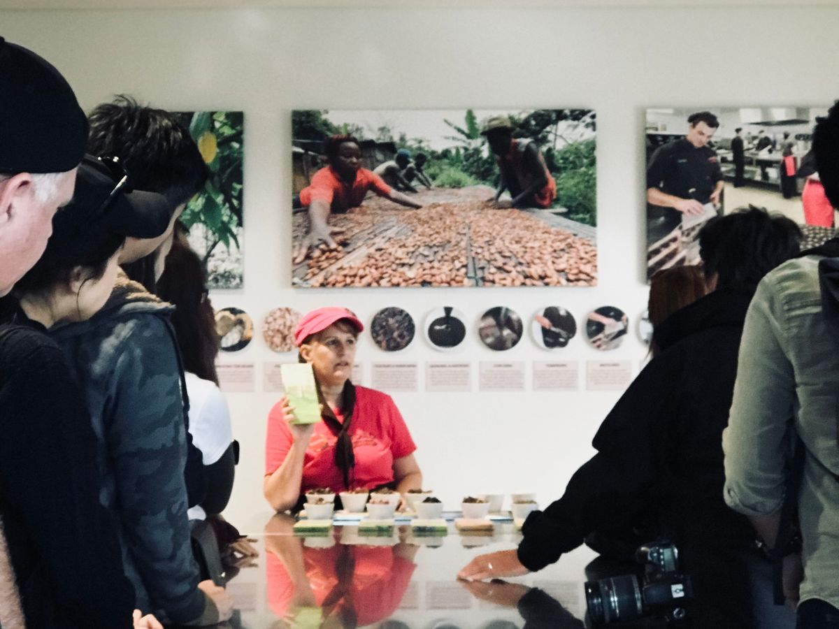 最後はチョコレートショップへ。ツアーのパスをくれるので首から下げてチョコレートを試食。次から次へとフレーバーの異なるチョコレートが回ってきます。お店にも試食できるものがありますが、このツアーではそれとは別の実際の商品を食べることができてお得感あり。