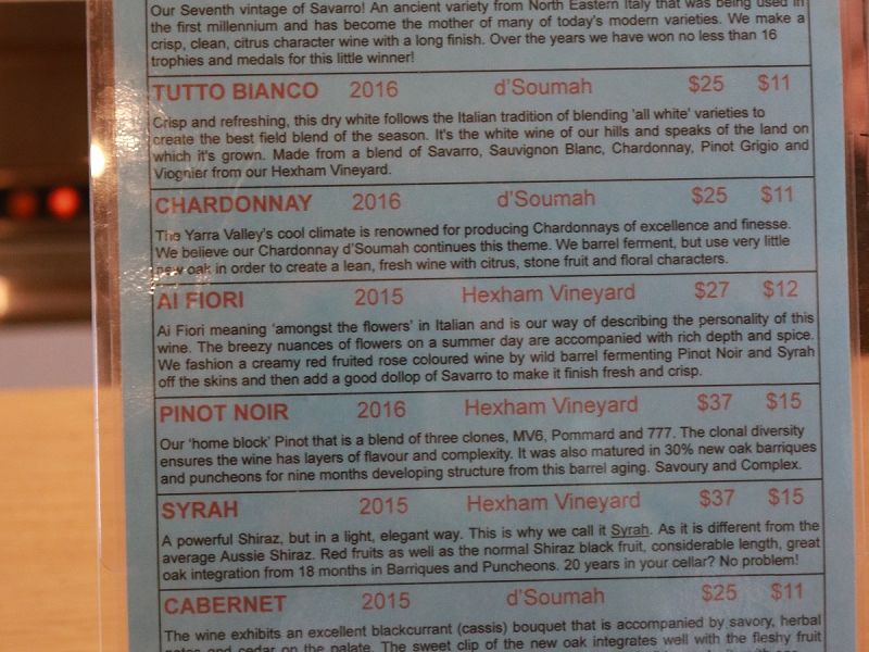 最初に訪れたヤラファームフレッシュの新鮮な果物とアップルジンジャージュースに始まり、一件目のワイナリーで4種類ものワインを試飲して、昼食を挟んでから二件目のイヤリーステーションワイナリーへ。ここはオーストラリアワインを語る上では外すことのできないワイナリーで、ここではどの食べ物に合うワインなのかなどの説明がありながら試飲することができました。