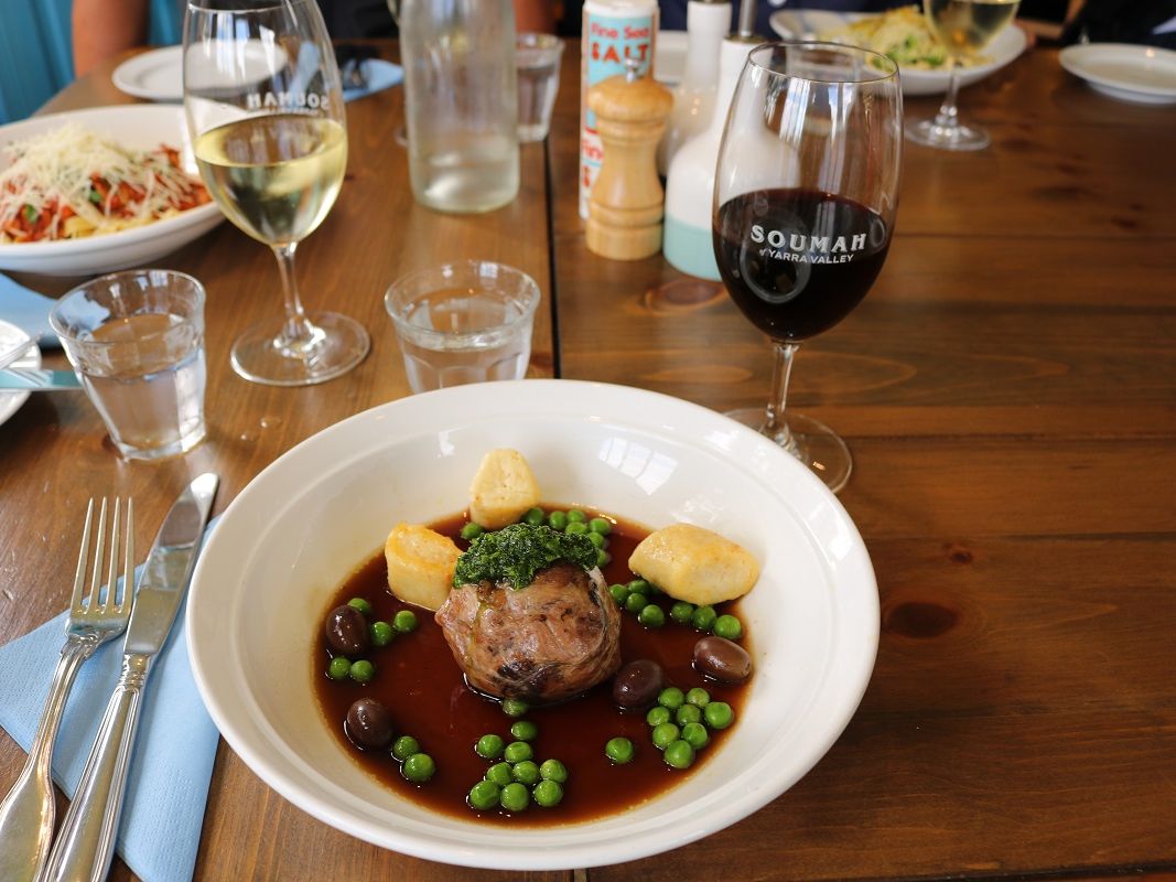 訪れたワイナリーどこでも、試飲で4、5種類は飲ませてくれます。一口ではなく、結構な量を入れてくれるので、ワイン好きにはたまらないと思います。1件目でドライバーさんが、軽くワインのテイスティングの仕方を教えてくれました。昼食ではラムが美味しいというレビューを読んでいたので、私はラムシャンク、友人はチキンを食べました。ラムも美味しかったですが、チキンもあっさりしていて美味しかったです。3件目のイエリング・ファームではワインの他にアップルサイダーも1種類試飲できました。最後の、ドメイン・シャンドンは他のワイナリーと比べても規模が違い、お客さんの数も多くてとても賑わっていました。素敵な景色を見ながらのワインは最高でした。