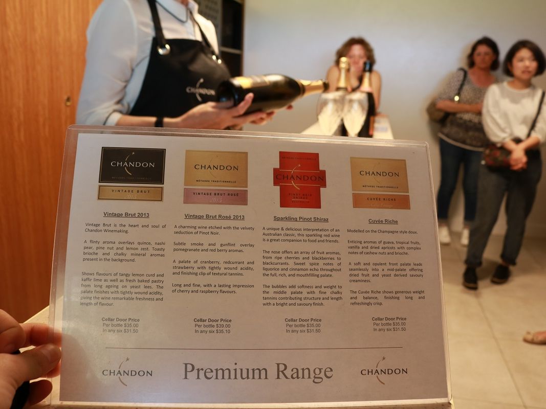 シャンドンを含め4ヶ所のワイナリーはどこも丁寧に説明してくれて良かったです。テイスティングもいろいろな種類をゆっくりできました。ツアー代金に含まれてるランチは数種類から選べお肉が柔らかくてそのワイナリーのワインととても合っていました。友だちの選んだパスタメニューも美味しかったそうです。シャンドンではスクリーンを使って説明してくれたので分かりやすく、ワインセラーにも入ることができました。ビンテージものも含めてテイスティングした後、好みのワインをテラスでゆっくりと味わえ、まさに至福のひとときでした。ただ、乗ったバンの空調の効きが今一つなのが残念でした。でもそれ以外は申し分なく良いツアーでした。