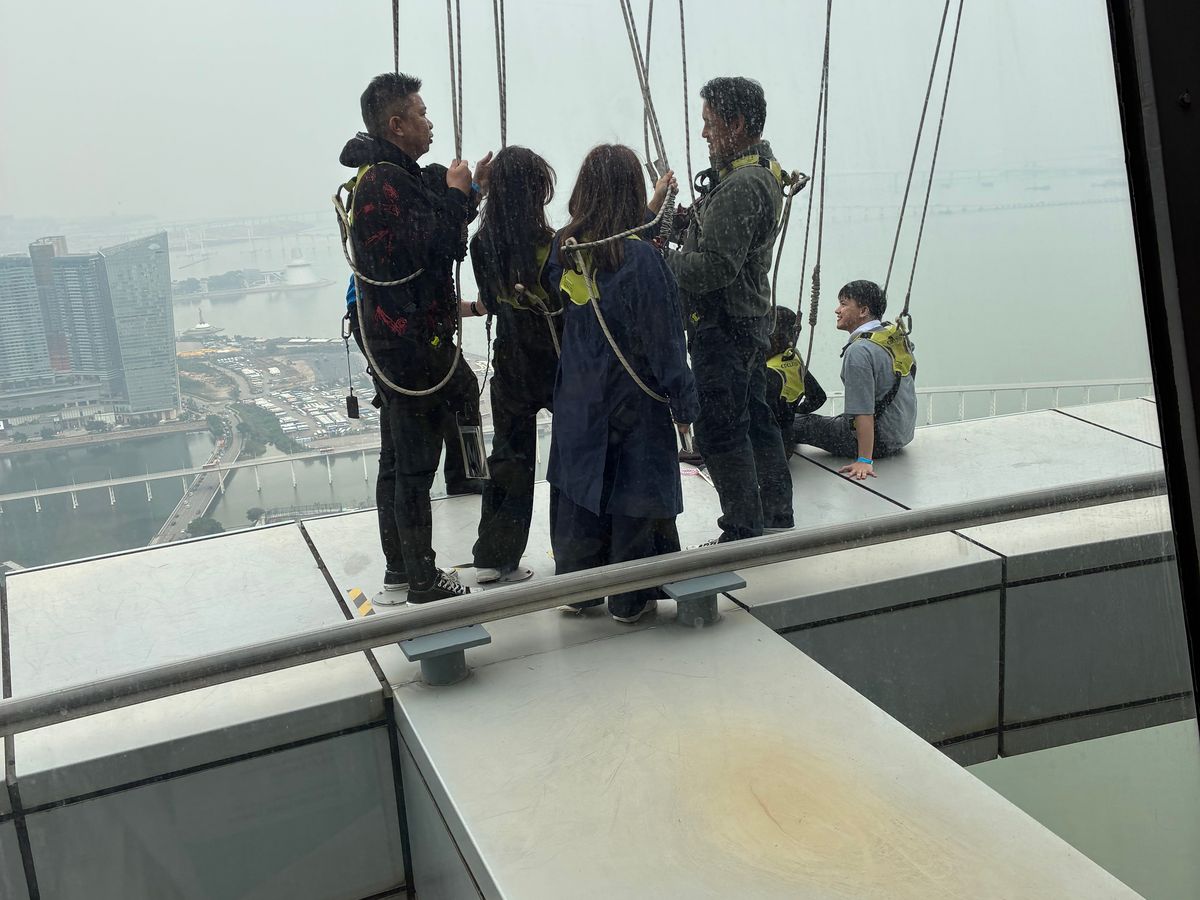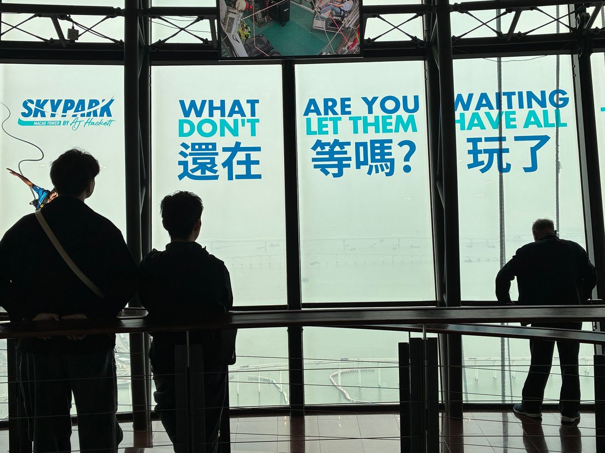 スタッフさんが、タワーの頂上から見える下階のタワー外で、何やら用意している?!まさか、バンジー?と、上階を見たら、飛びそうな人影が!笑