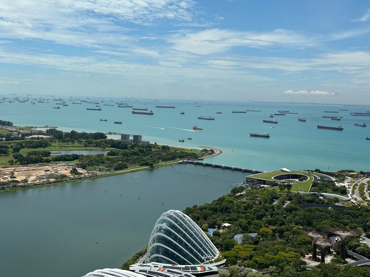 マリーナベイ・サンズの屋上から、海に浮かぶタンカー、ラッフルズホテル、マーライオンなど、シンガポールを一望できます。