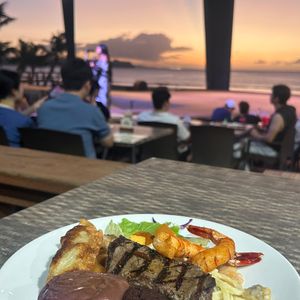 食事はビュッフェスタイルで、ステーキと海老はチケット交換性でした。トイレも綺麗でした。
