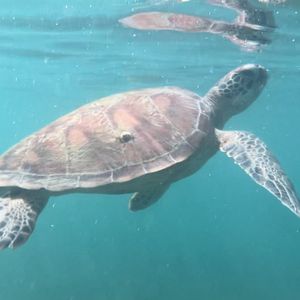 私は昼食後に持参したるるぶを見返しているとライフガードのいない方のビーチ(船着場から見える方)の桟橋のあたりでウミガメが観れるとの情報が書いてあったので1人で行ってみたところまさに情報通りで岸から100mも泳いでいない浅瀬だったと思いますがバッチリウミガメを見る事ができ3分くらい一緒に泳げて大満足でした!!大興奮で家族の元に戻り、今度は夫と7歳の長女で泳ぎに行ったところ彼らもウミガメを見れたそうです。私だけみられなかったと残念がっていた次女も帰りの船に乗る際に桟橋のところでウミガメを見れたのでよかったです。