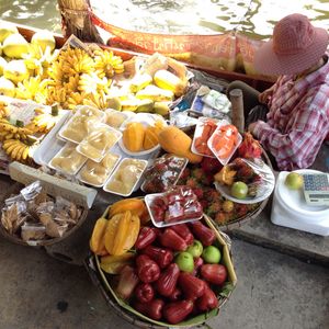 値段は高く、ガイドさんから説明があったように必ず半値くらいに値引きをして買いましたが、デパートなどの方が良いものが安く買える印象でしたので値引き交渉を楽しんだりする程度が良いのかなと思いました。別料金200バーツで40分ほど小船にも乗りましたが、ゆっくり見学出来ますし、時間もたっぷりあるのでその後も買い物の時間が十分あり、おすすめです。ガイドさんから美味しいフルーツやバナナ天ぷらなどの差し入れもあり、うれしかったです。