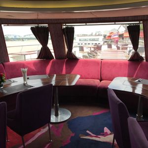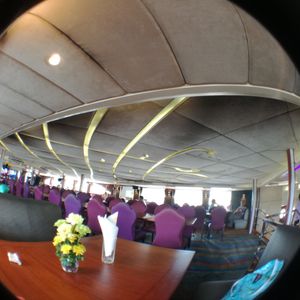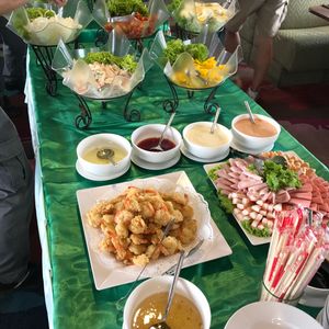 タイ旅行最後の日に記念にと思って友人と申し込みましたが、まず席の上のエアコンからずっと水がぽとぽと落ちてきて困りました。料理は海老ばかりで、サラダはパクチー風味のものばかりで苦手なのでおいしくなかったです。バイキング形式だからたくさん取ったけど、残してしまうものが多かったです。音楽も歌う人とギターの人のふたりで知らな曲が多くてイマイチ。まぁまぁの値段なので、もっとお得な値段で演奏も料理も無しのクルージングだけでよかったかも。寺院等のライトアップは綺麗でした。